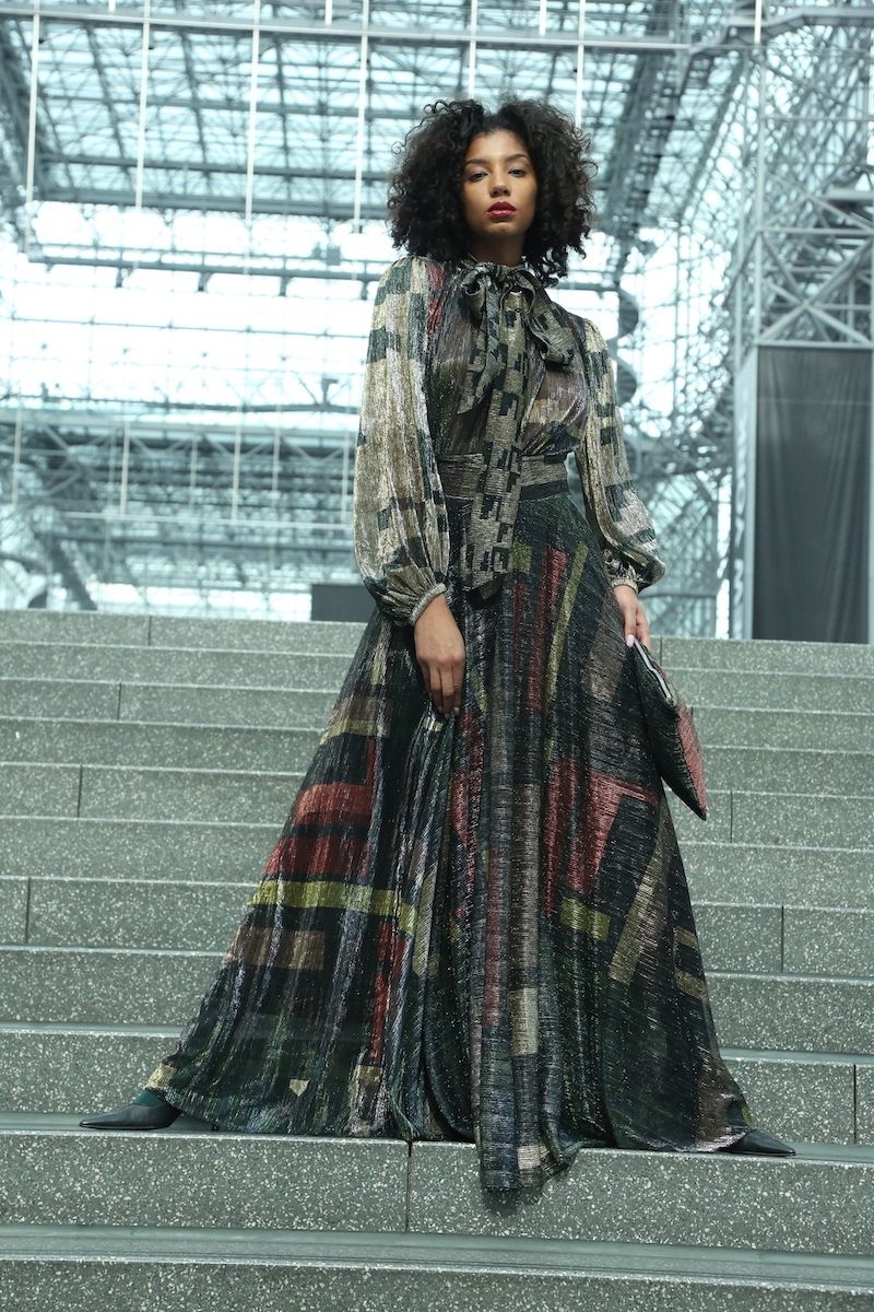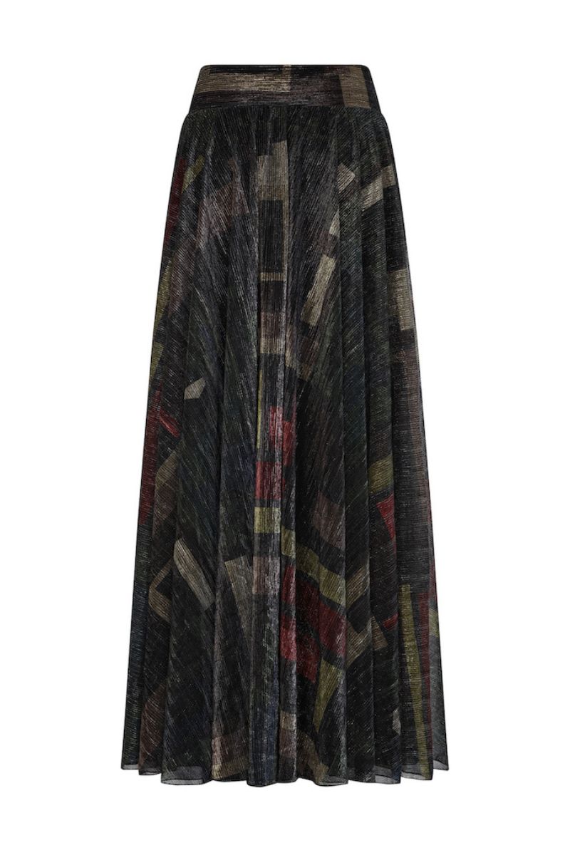 - A-line silhouette with sharp pleats and bold, flowing shape