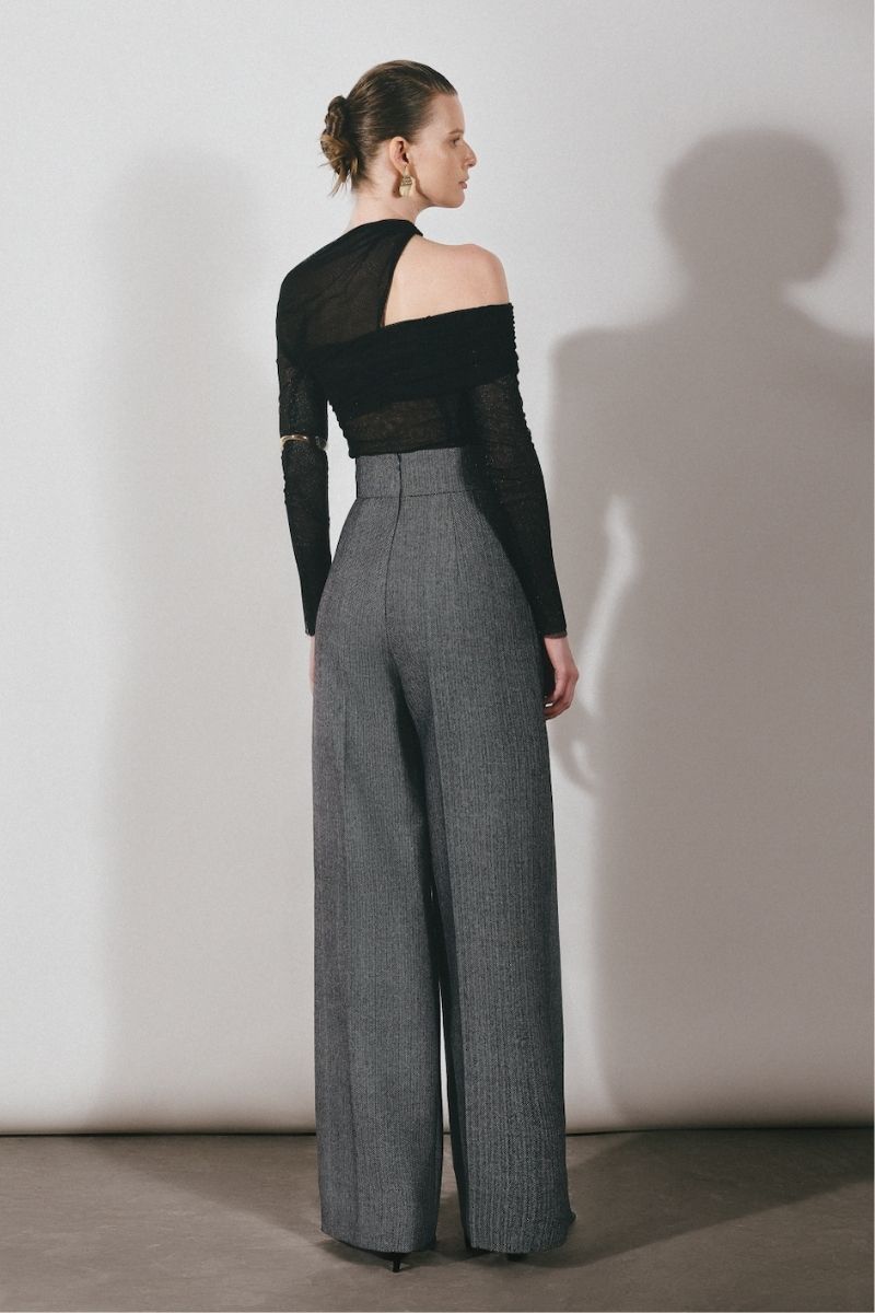 This luxurious top features a unique asymmetric neckline and delicate tulle fabric, creating a sophisticated and exclusive look. Perfect for any occasion, this top will be sure to turn heads and leave a lasting impression,