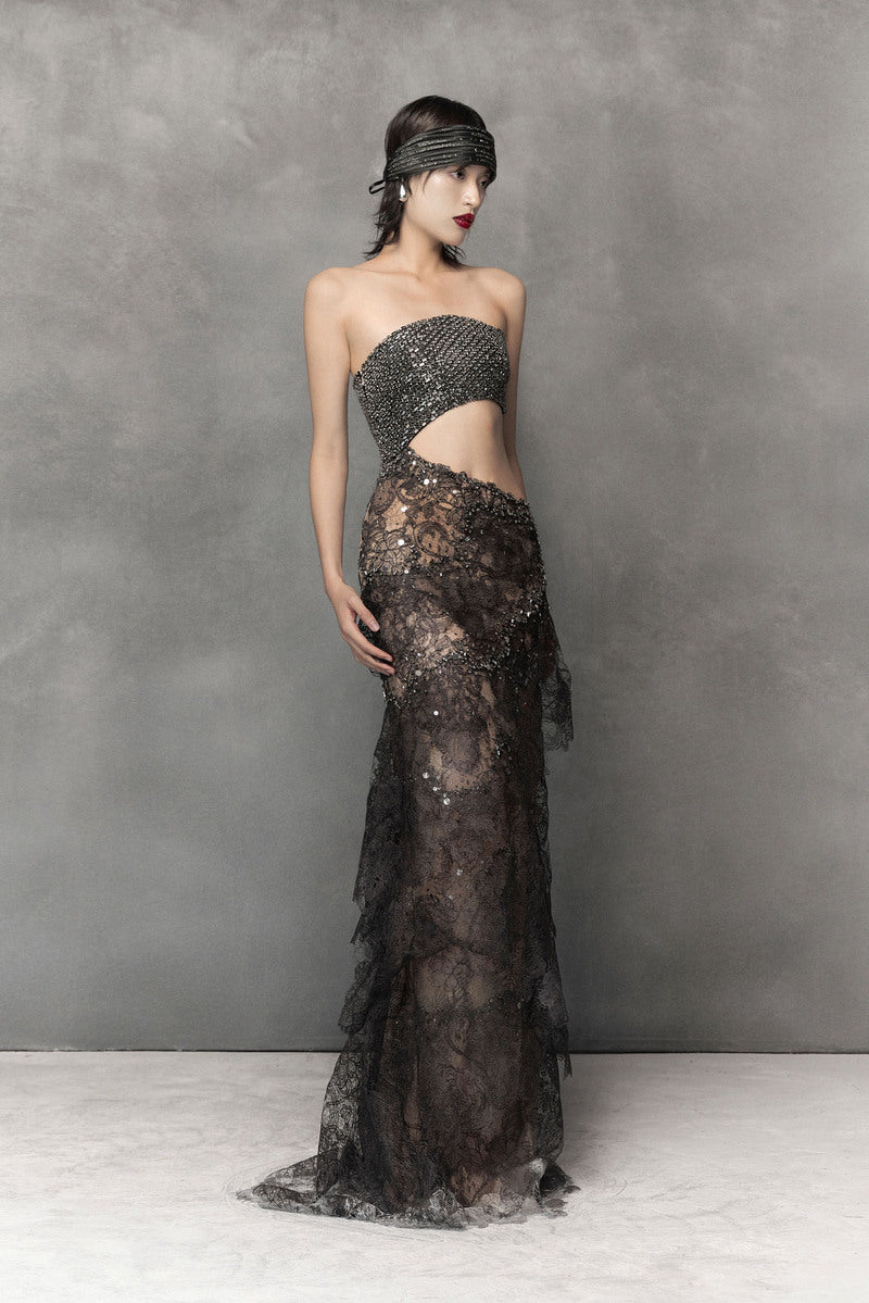 This is a strapless gown with a beaded top, lace skirt, and a cut-out midriff.