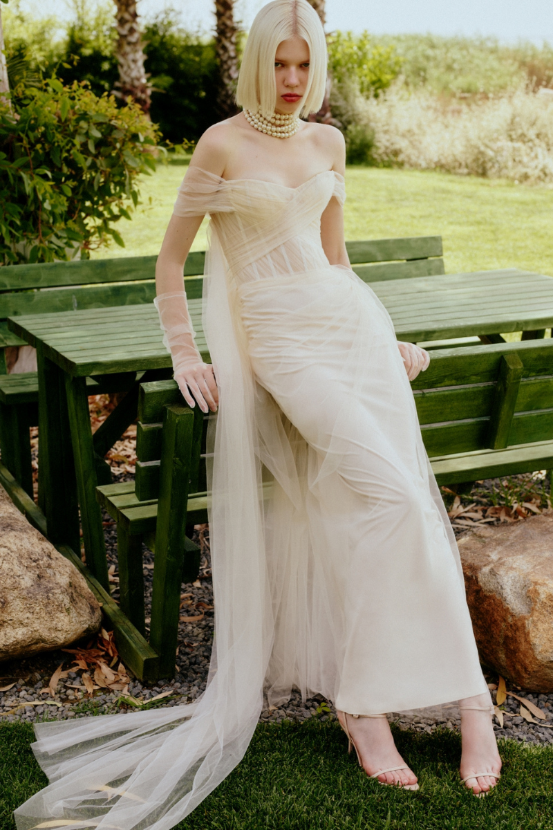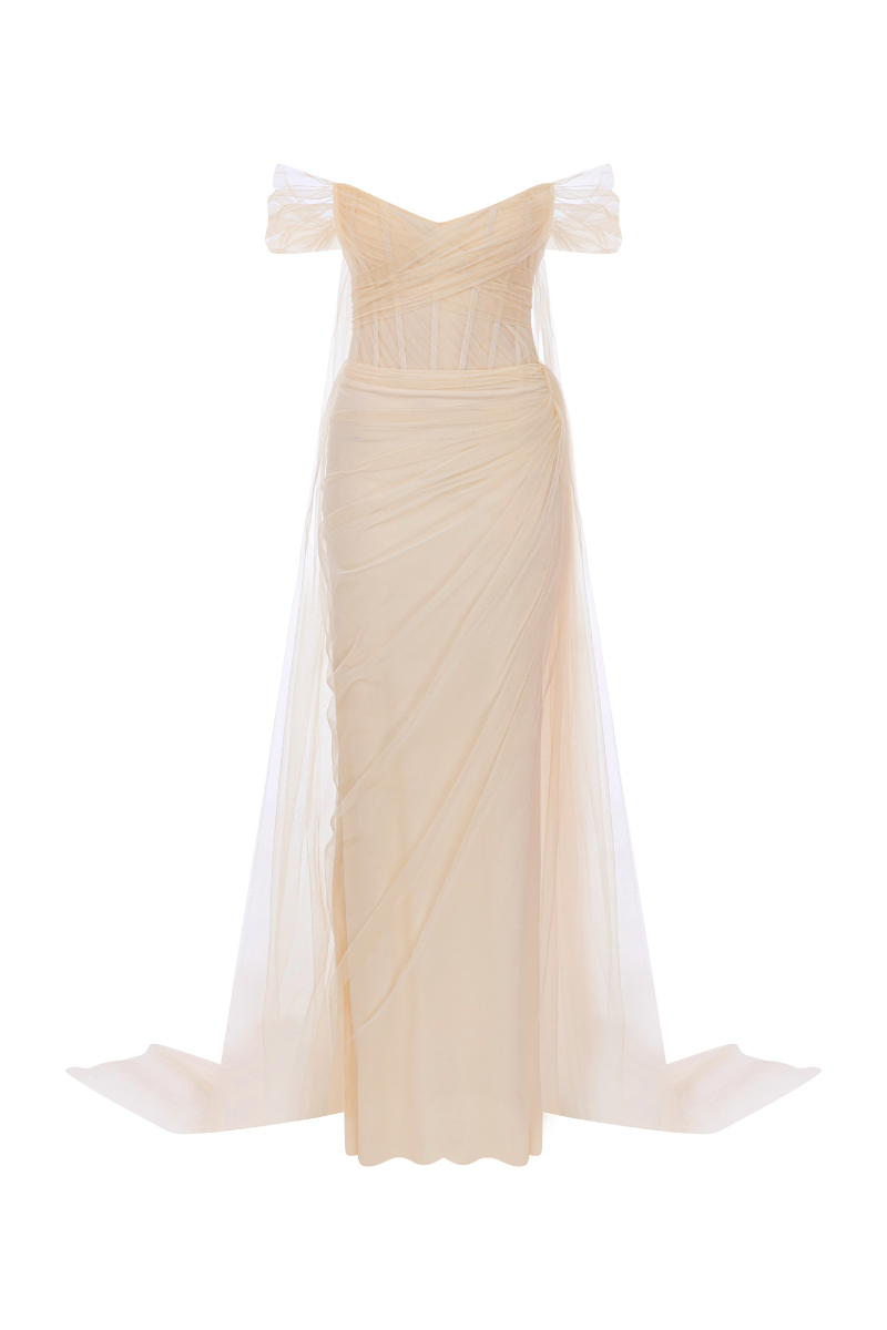 Cream Tulle Corset Gown with Cape features a strapless design, zipper closure at center back, fully lined construction, draped detailing, and a fitted corset for a luxurious and flattering fit. True to size.