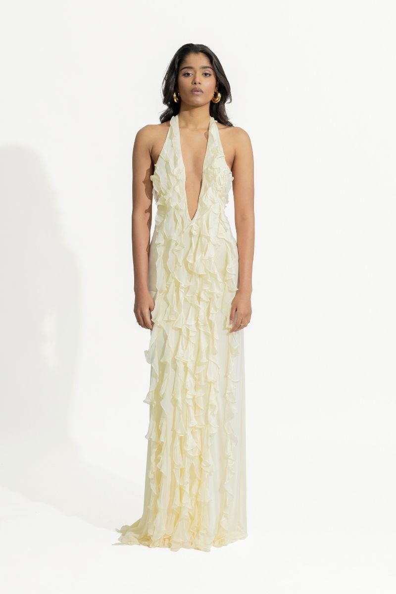 The deep V-neck halter gown features stunning flowy ruffles and a striking backless design.