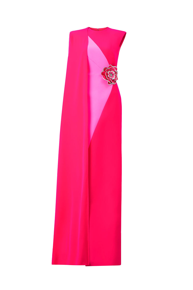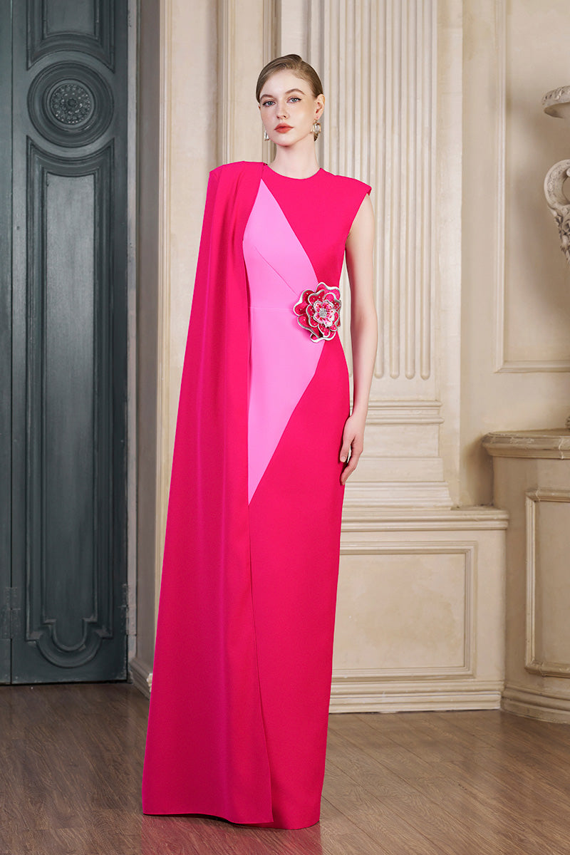fuchsia column gown with attached one shoulder long cape