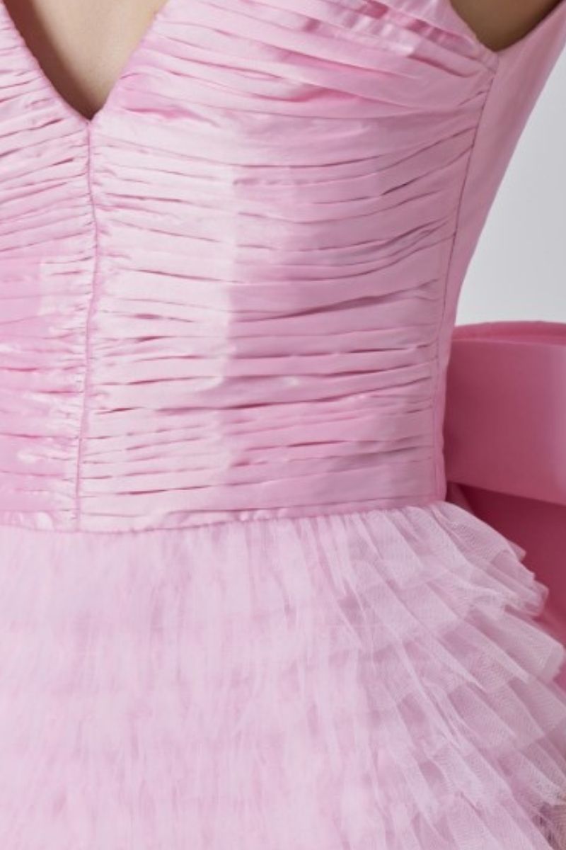 The bodice is made from taffeta, with horizontal pleats adding texture and shaping to the silhouette. The skirt is crafted from layered mesh, with multiple tiers of gathered fabric, enhancing the dress's playful and flirtatious vibe.