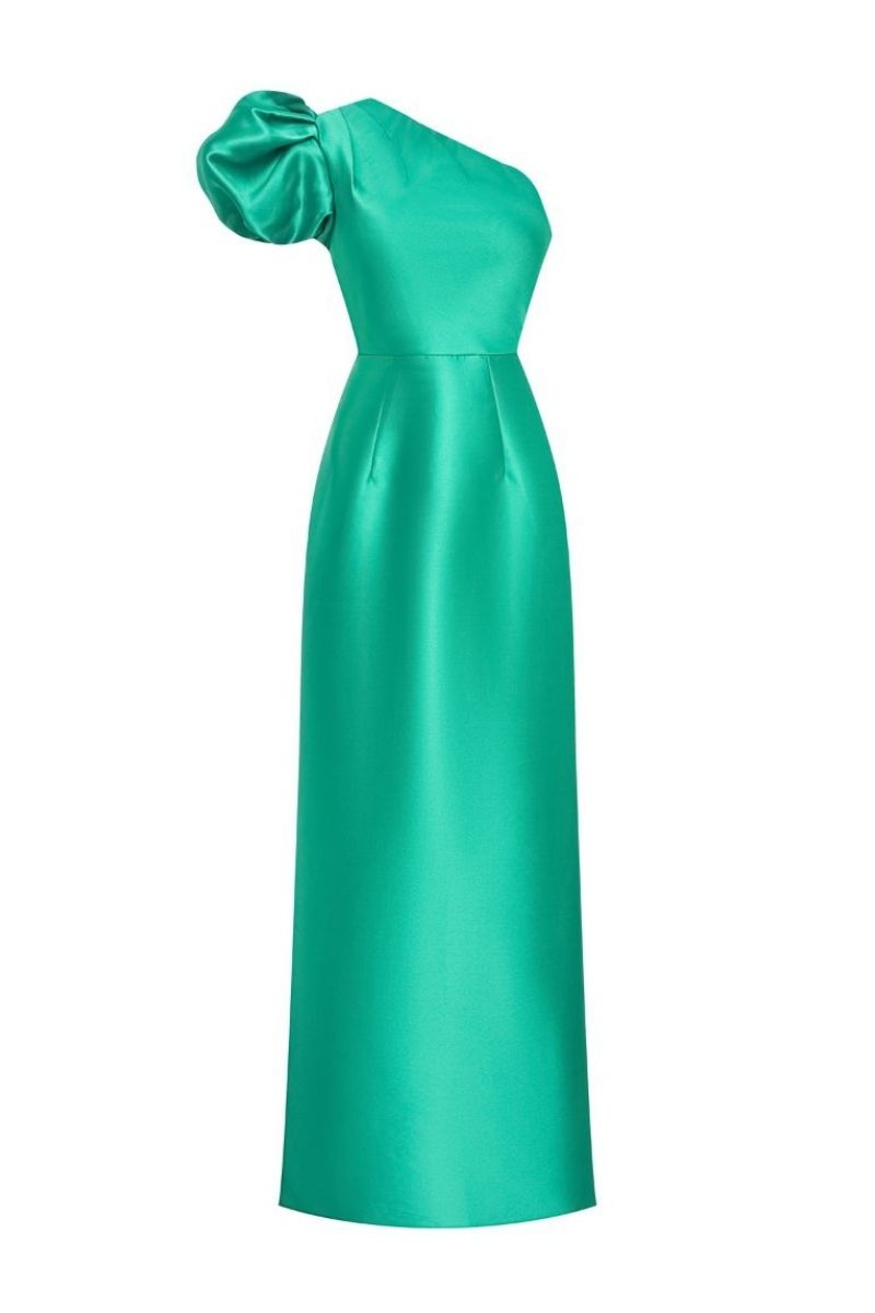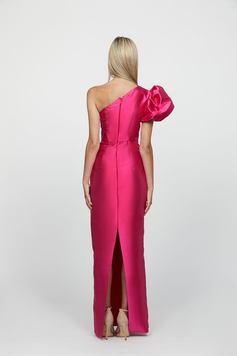 The MARCHESA ONE SHOULDER GOWN is the epitome of elegance featuring an asymmetric neckline and soft shoulder pleats. The single puff sleeve is adorned with bespoke pleat detail, adding a touch of exclusive allure. The fitted bodice ensures a flattering silhouette, with built-in bust cups and hidden boning for added support. Completing the ensemble is a gown-length column skirt with a daring back split, exuding ease with every step. Prepare to enchant onlookers at any event with this exquisite gown, where modern design meets timeless allure.