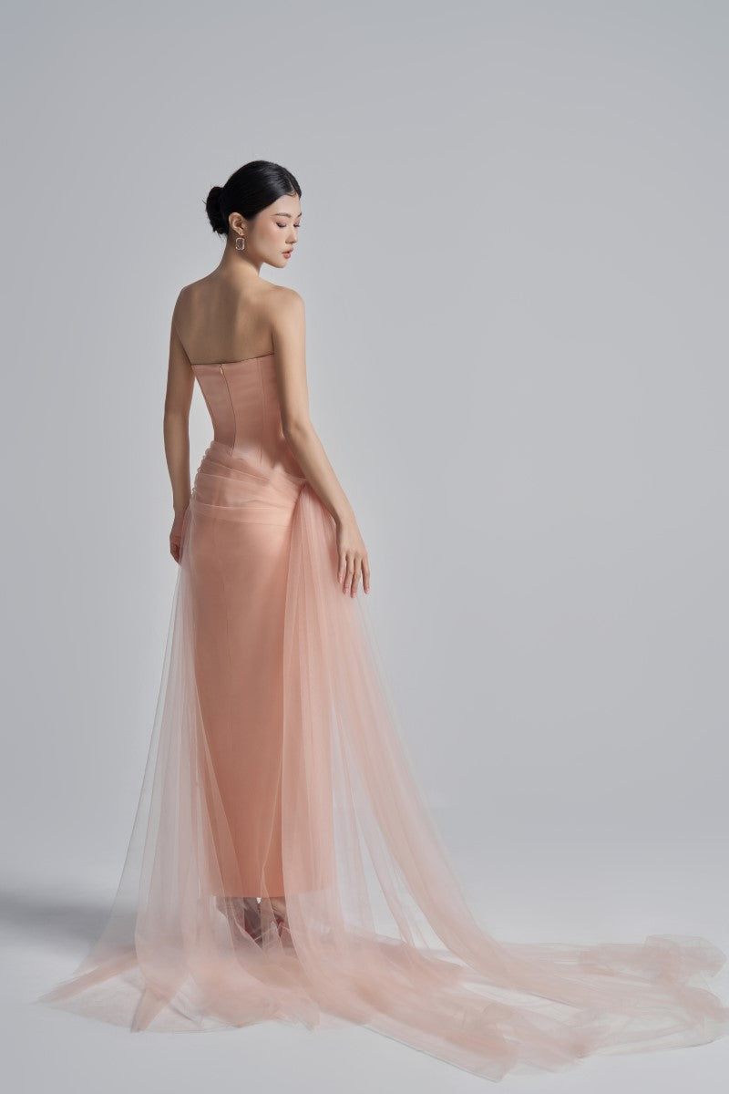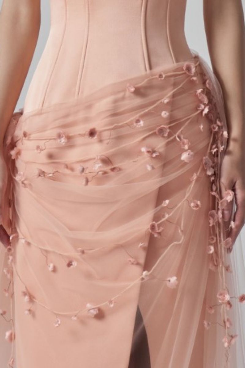 The highlight lies in the unique draped tulle overlay at the hips, meticulously ruched to create a flowing, ethereal effect. Delicate, handcrafted floral garlands wrap gracefully around the waist and cascade softly. Each flower is intricately laser-cut from silk and adorned with shimmering crystal centers, adding a touch of sparkle and refinement.