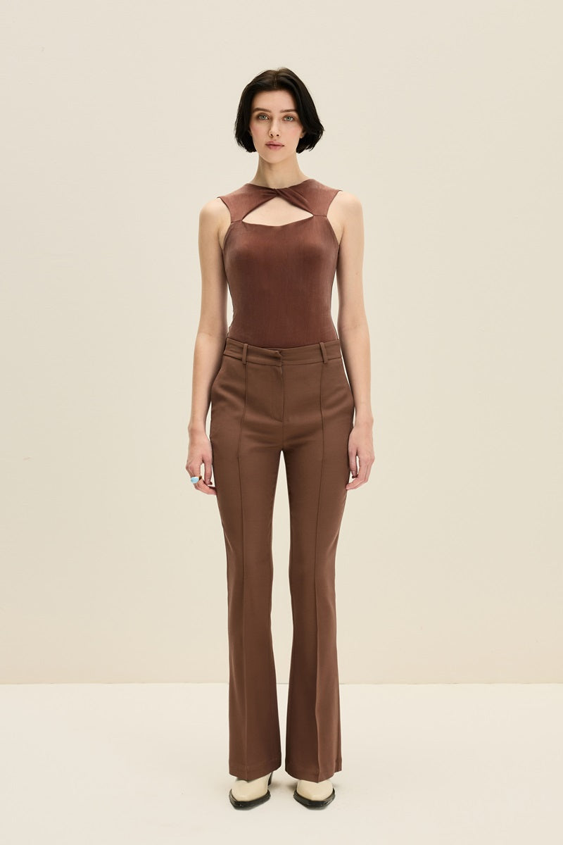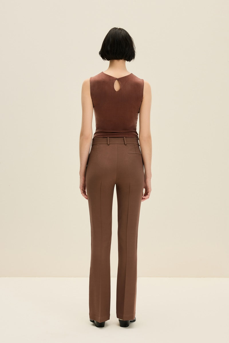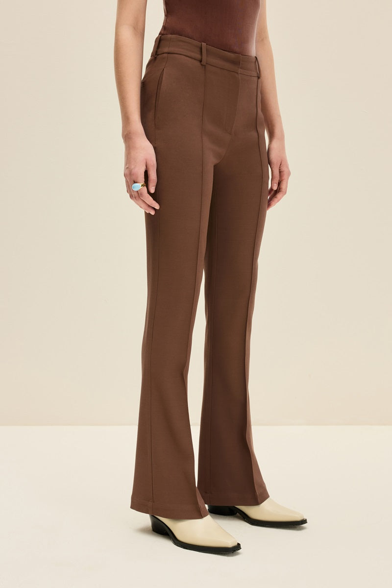 Elevate your wardrobe with these brown flared pants. Crafted from viscose and wool blend, they feature front seam detailing that elongates the legs. The high-rise waist with belt loops offers versatile styling, while the slim leg flares slightly at the hem for a touch of retro flair. Perfect for both professional and casual settings.