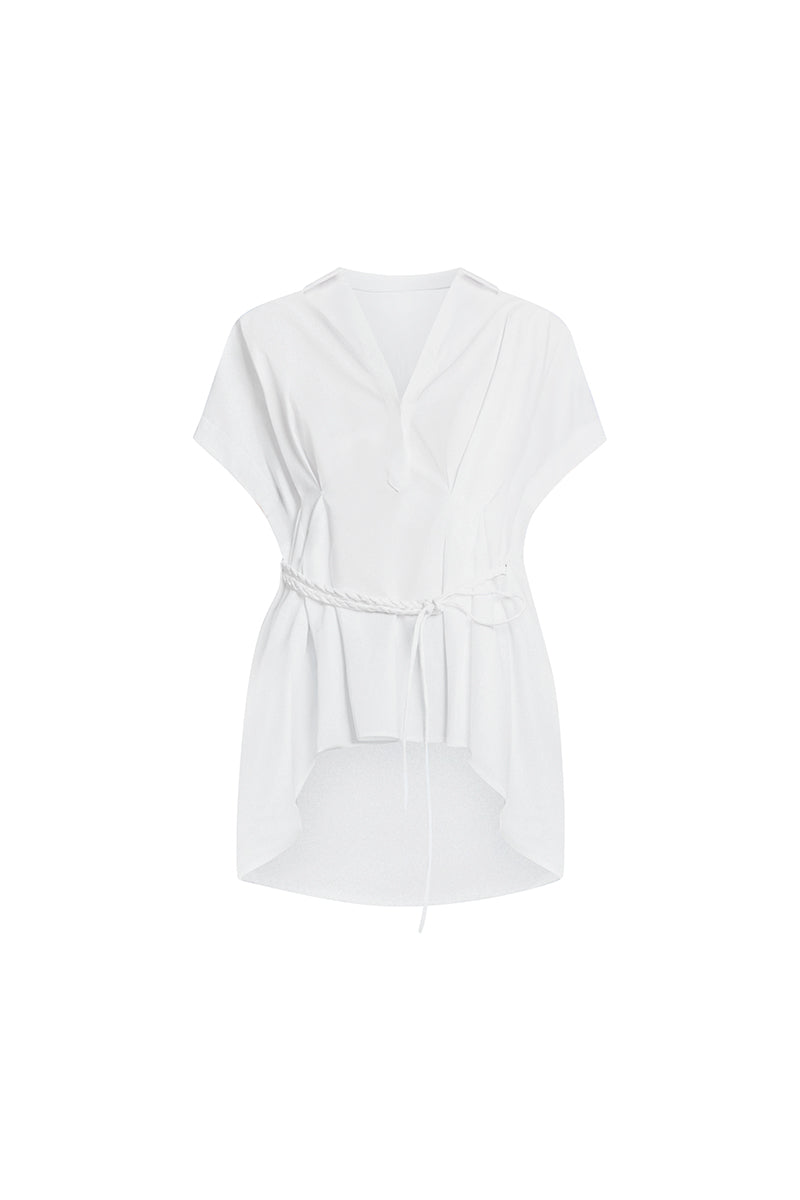 Crafted from poplin fabric, featuring a symmetrical collar that adds a bold and striking touch.