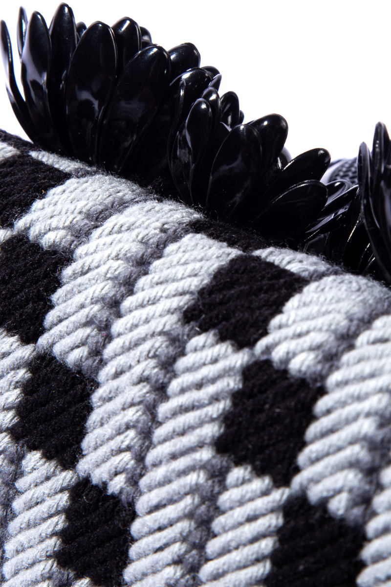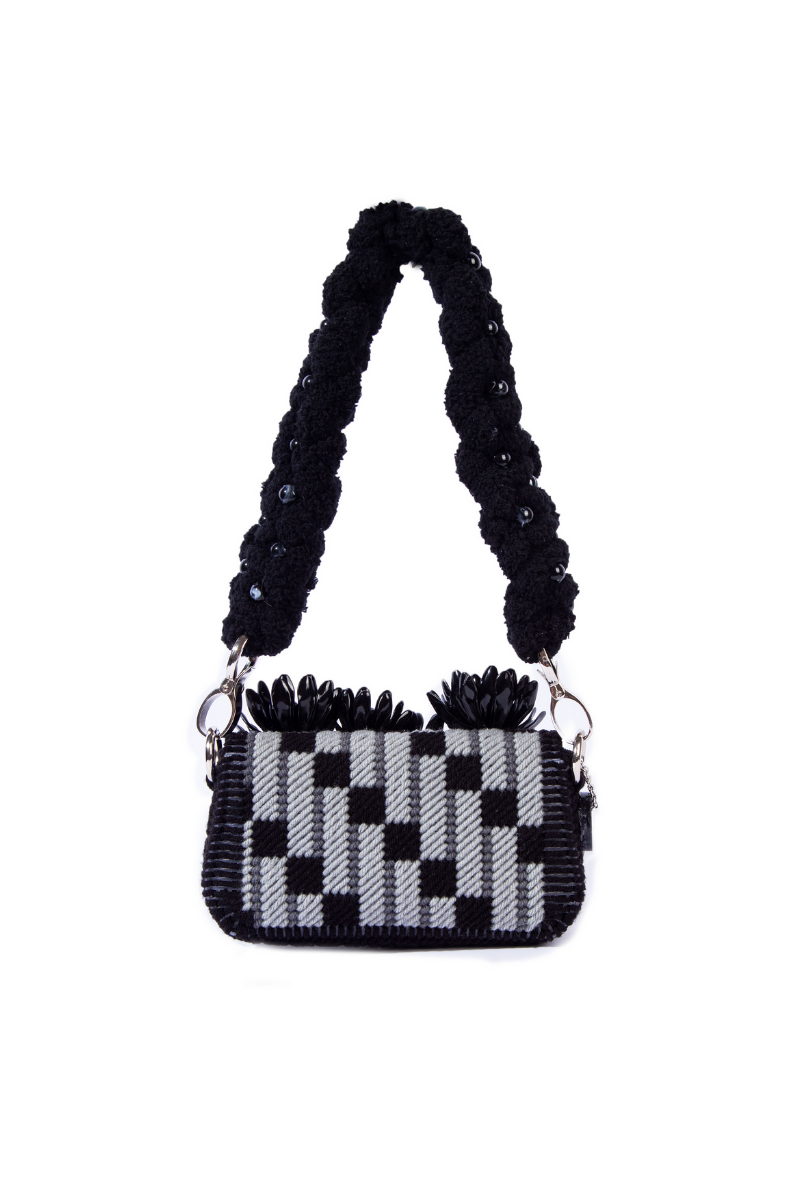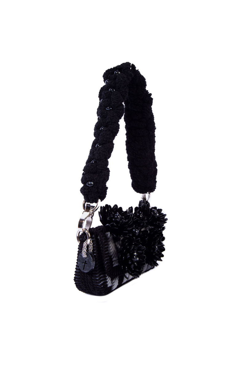 This BLACK ATACAMA SILK SHOULDER BAG features expertly crafted wool stitching, a seamless magnet closure, a luxurious chenille hand-braided strap, a statement acrylic flower petal, a sturdy metal ring, and chic marble beads.