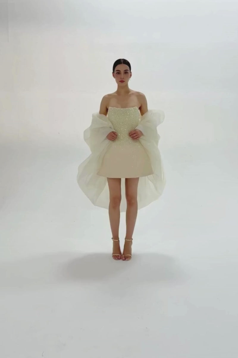 This exquisite mini dress embodies a perfect fusion of elegance and modern sophistication. The structured corset bodice, adorned with delicate crystal beading, radiates a luminous glow, enhancing its luxurious appeal. The bell-shaped skirt adds a touch of playfulness while maintaining an air of refined grace.