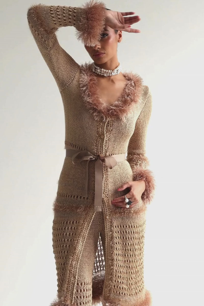 Brown Handmade Knit Cardigan-Dress with Pearl Buttons is spun from a soft silk-blend. This mid leght brown handmade knit cardigan definitely makes you unique during summer and winter time.
