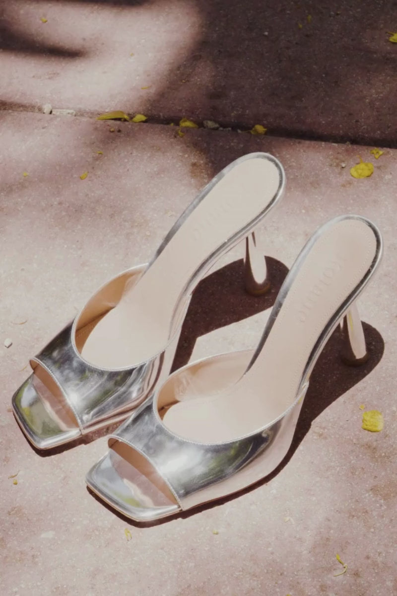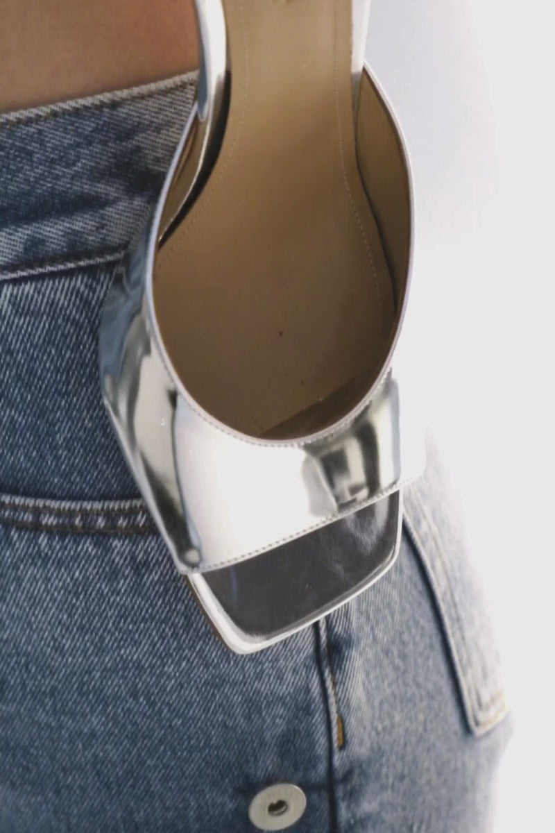 The Greta mule combines classic elegance with a modern sculptural heel. Crafted from mirrored leather, this shoe creates a striking interplay of reflections, especially under low light. It features a low-cut upper set on a comfortable 70mm square-toe heel. Wear yours casually or dressed up.