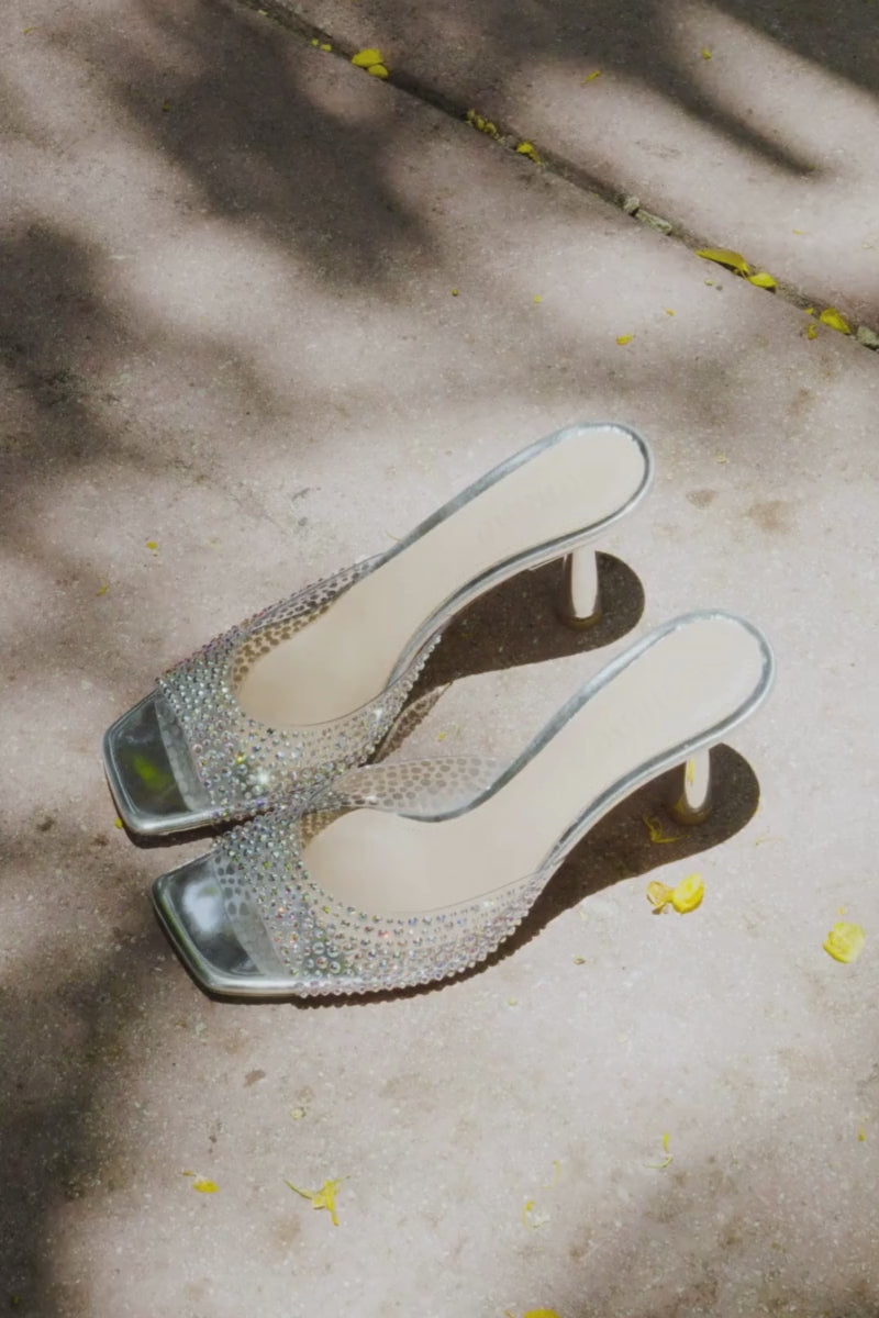 The Greta mule combines classic elegance with a modern sculptural heel. Its silhouette exudes glamour, featuring a clear PVC strap embellished with iridescent Swarovski crystals in three sizes for a whimsical touch. Reinforced with leather lining and set on a comfortable 70mm square-toe heel, it effortlessly transitions from dinner to dancing.