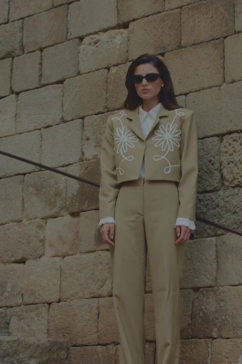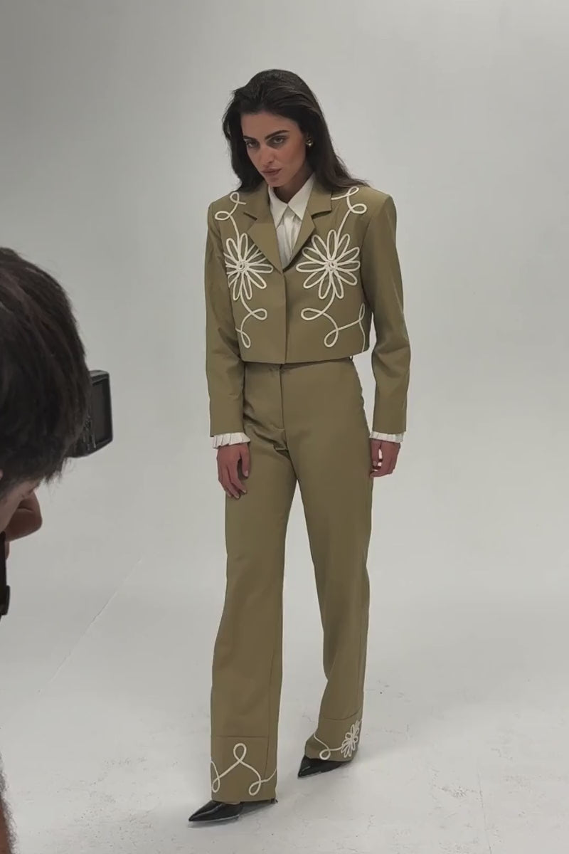 - Tailored style trousers with delicate white floral embroidery on the cuffs.