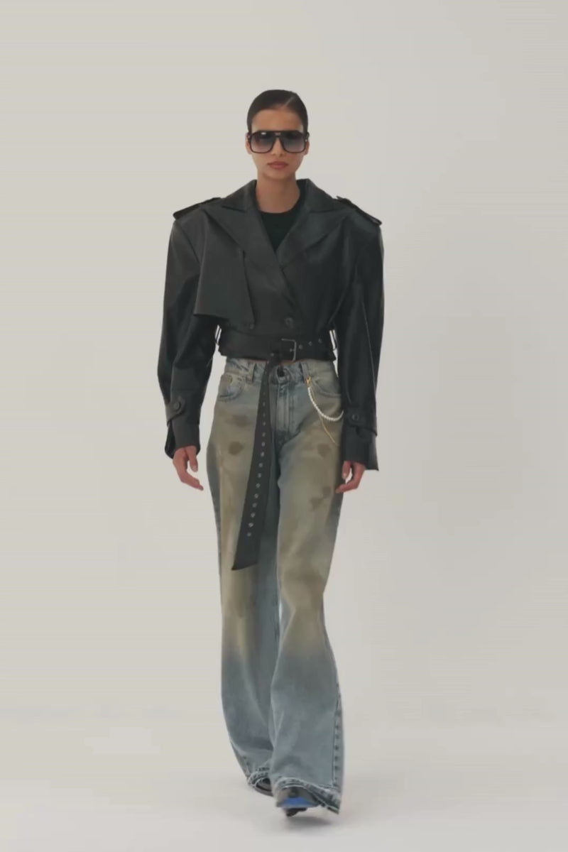 A leather jacket in the style of a biker jacket, in black. It features a prominently structured shoulder line, geometric lapels on the front, and a wide, long belt with rivets to accentuate the waist. The model is perfected in every detail, including branded buttons, a nickel-plated buckle, and a high-quality lining. The Novara jacket exudes both character and fashion sense. The Giacche di Pelle line is crafted from Italian leather in a Polish artisanal workshop with many years of experience and tradition.