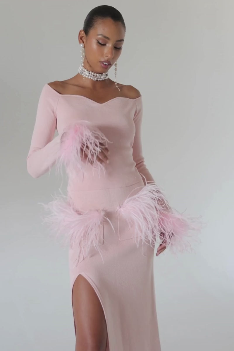Pink Vanilla knit top with detachable feather cuffs is always on trend. These top creates perfect feminine silhouette and makes look you elegant and chic. You can wear it for a day and night time and it always looks amazing. Perfect combination with Pink Vanilla knit skirt with feathers.