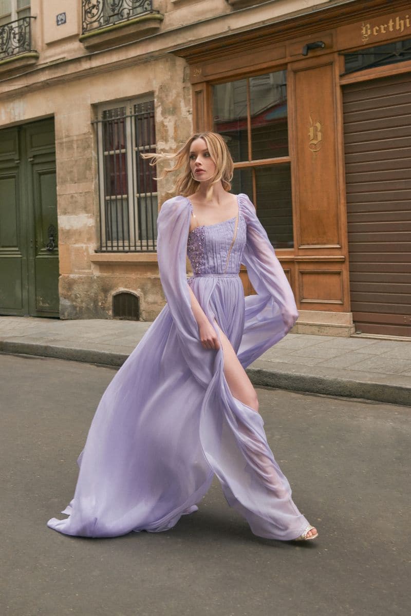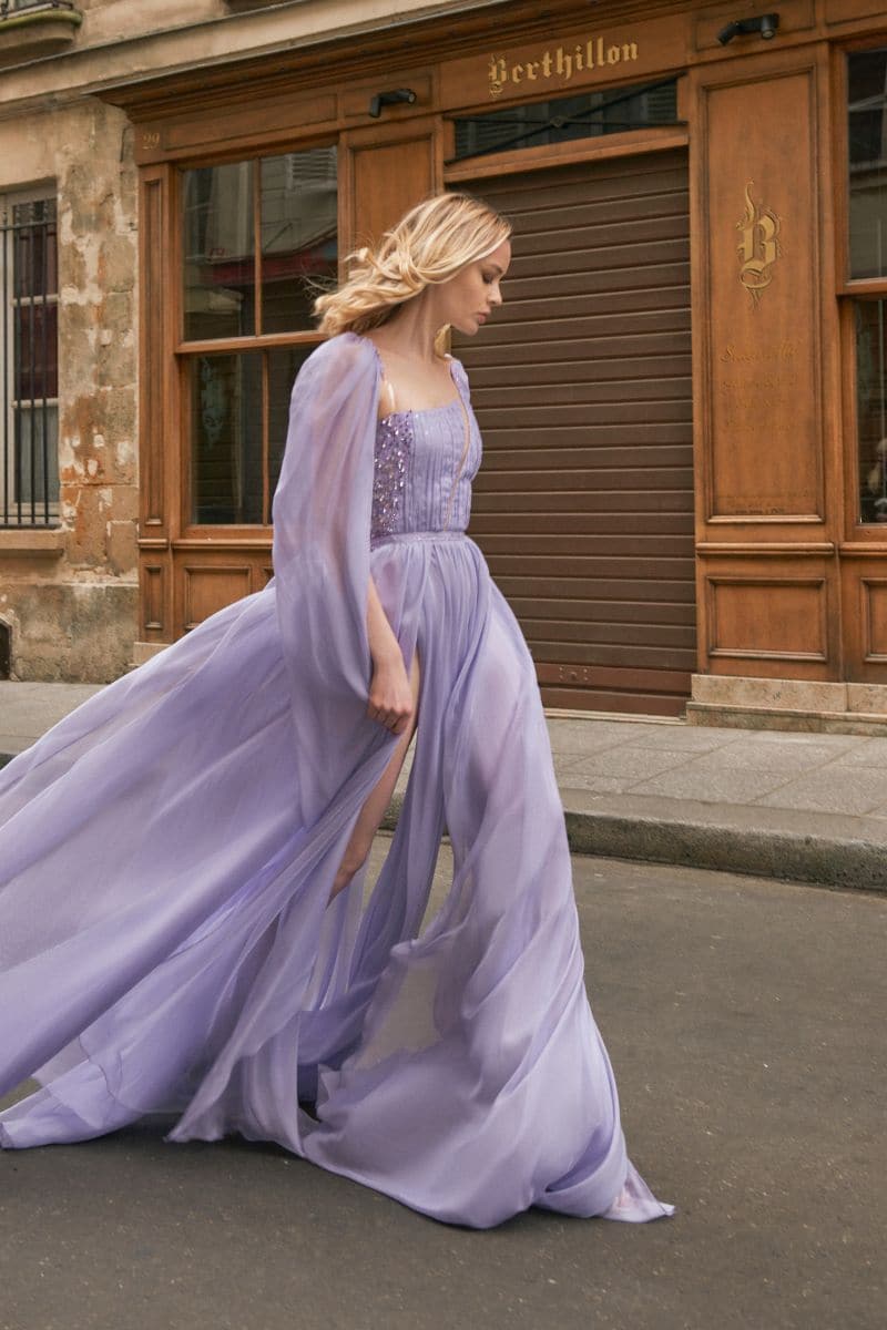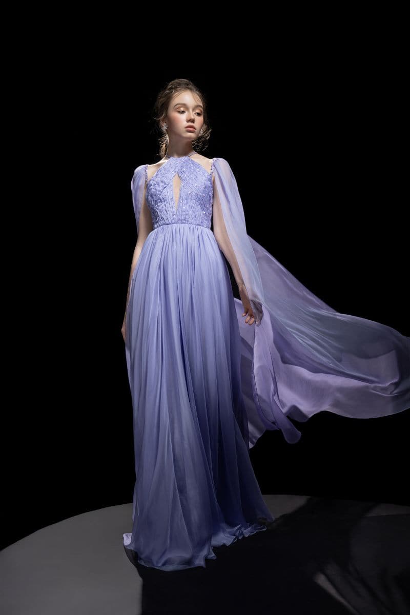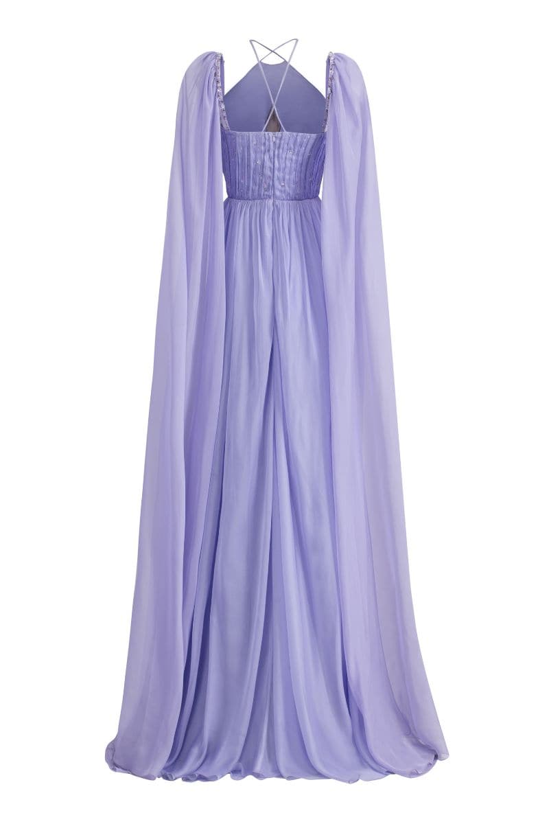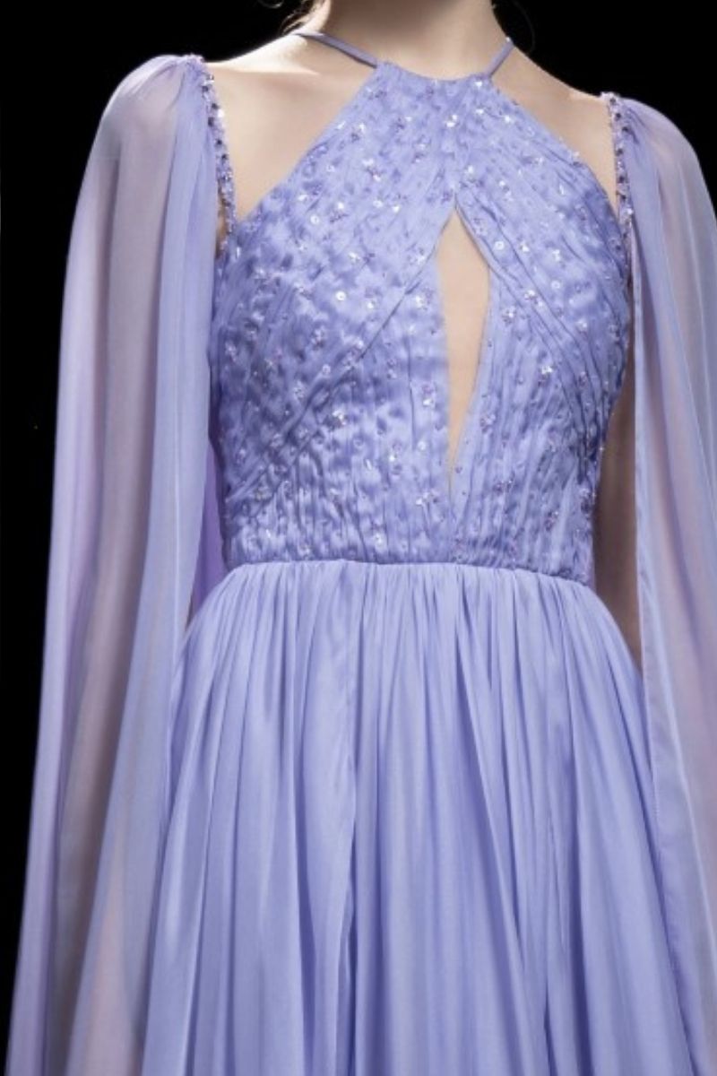 Cut out evening dress with halter neck cape sleeves and attached handmade crystals. By using high-quality material that created a smooth and flighty look for this dress. The long cape sleeves form helps to bring an irresistible attraction to the wearer.