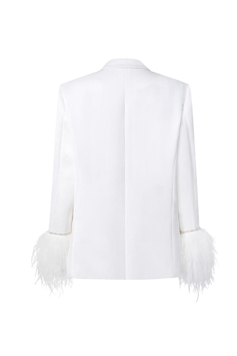 This WHITE KIERA TAFFETA FEATHER BLAZER is crafted from luxurious taffeta in a tailored silhouette. The long sleeves with padded shoulders and a single-button front showcase a notch lapel and functional flap pockets. Eye-catching details come in the form of feathers at the cuffs and a heart-shaped crystal beaded embellishment.