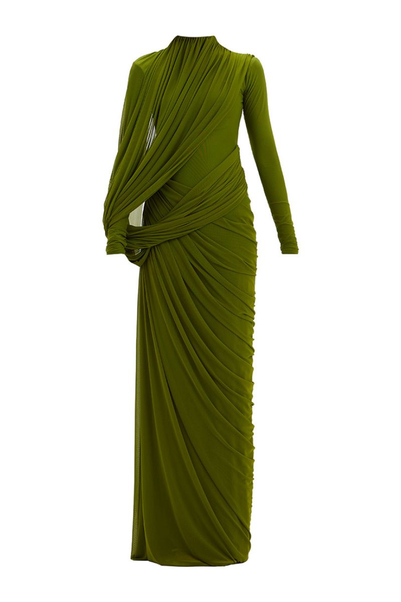 - A high-neck gown features full sleeves and an artfully draped bottom that cascades asymmetrically from one side. At the top, a pleated drape flows from the neckline, elegantly twisting around the arm and anchoring at the side to form a soft loop