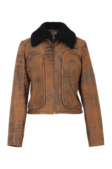 This luxuriant WASHED BROWN EMERY LEATHER JACKET offers a timelessly chic look crafted from distressed leather and cleverly designed with a removable shearling collar and metal zip fastening to the front.