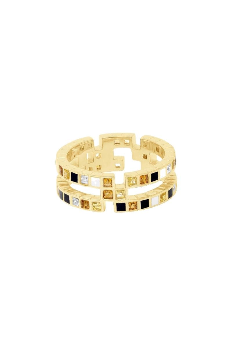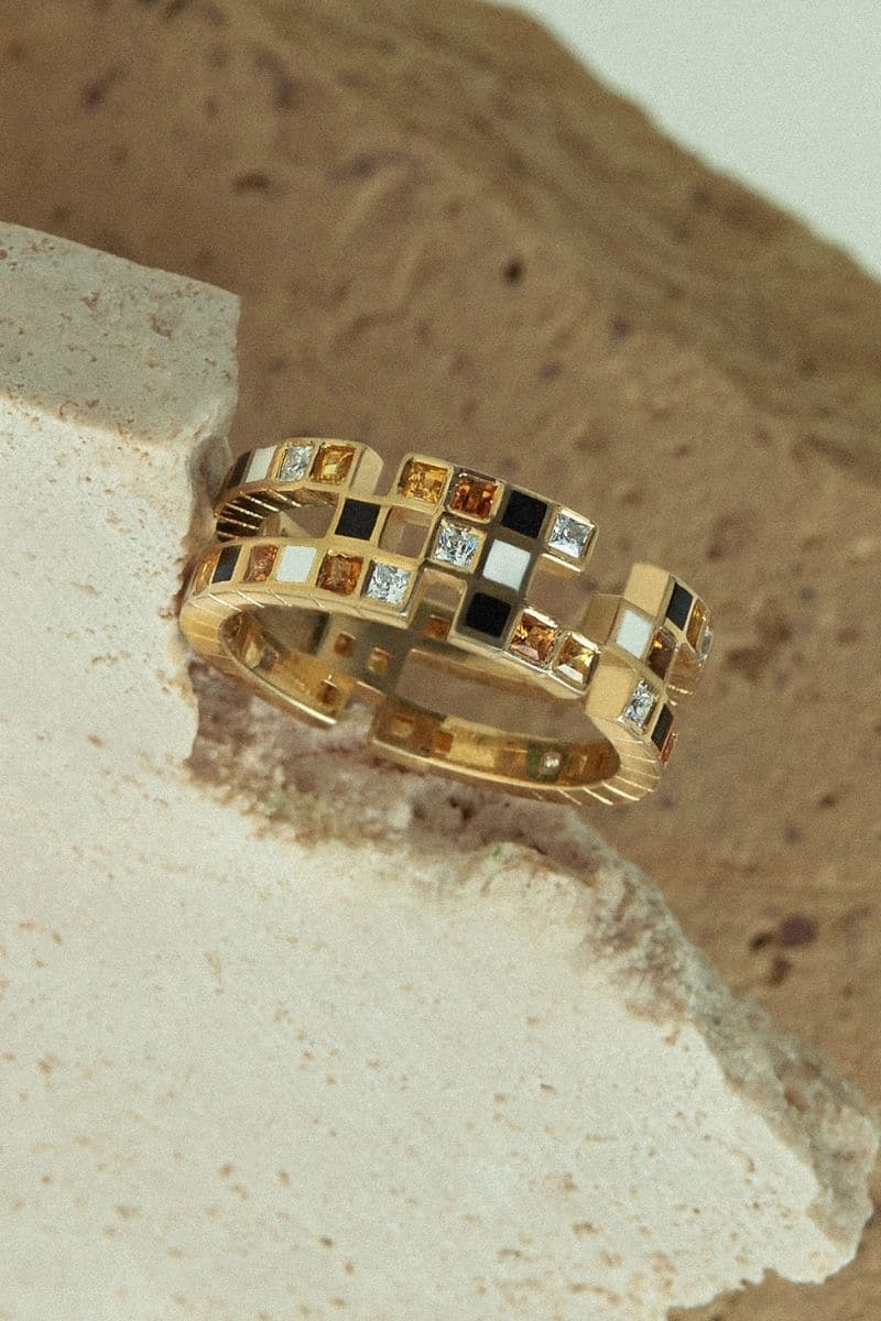 The Chichi ring is a whimsical yet elegant design that features an arrangement of cubes inspired by Modernism and Cubism arts, and It depicts a galaxy filled with dazzling stars. Each enamel is hand-painted in precision by our artisans, and each gemstone is ethically sourced and carefully selected by Edward. Therefore, each cube encapsulates a unique and fascinating story.