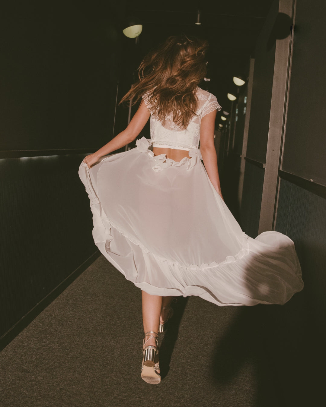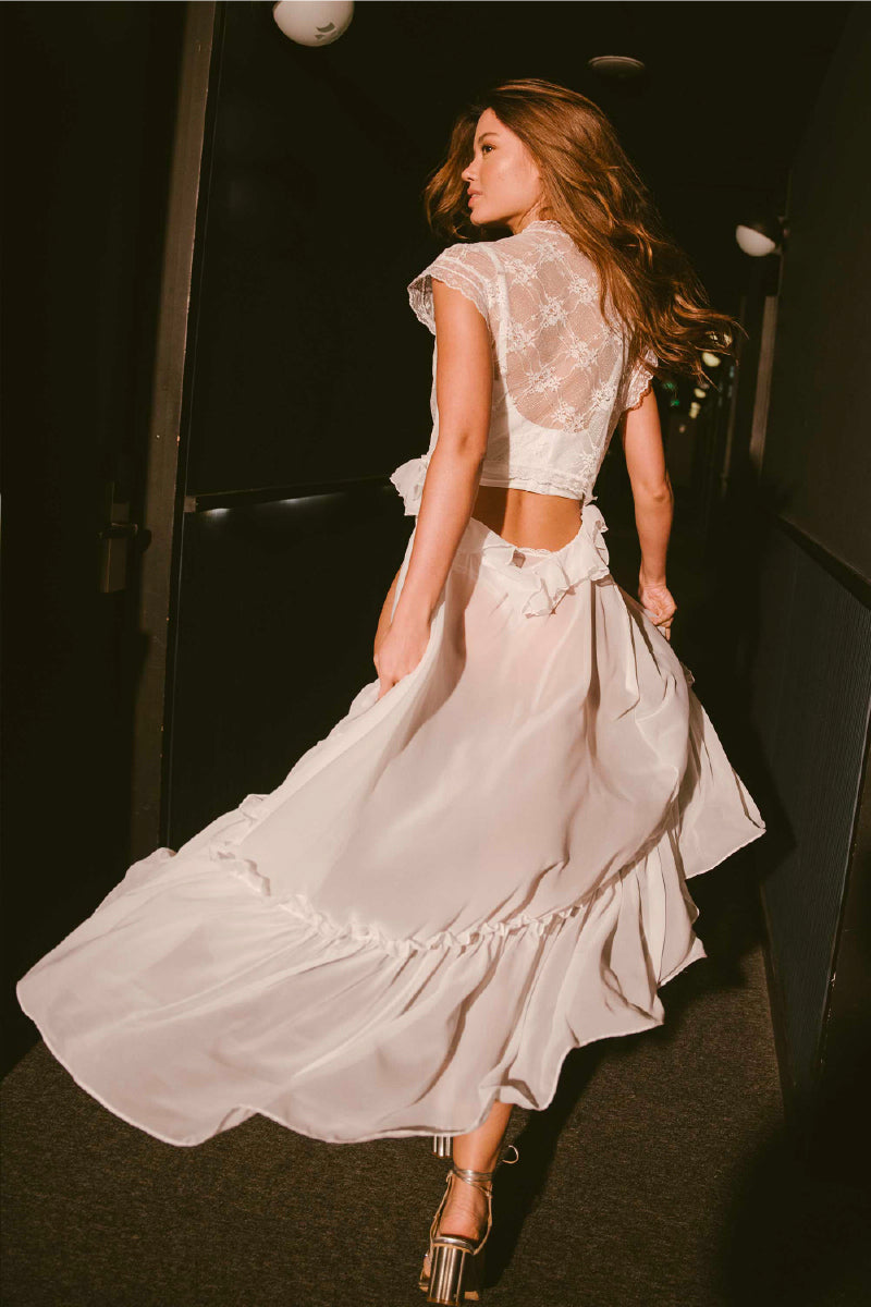 - The lace bodice detaches with hidden buttons, allowing it to be worn on its own as a cropped top
