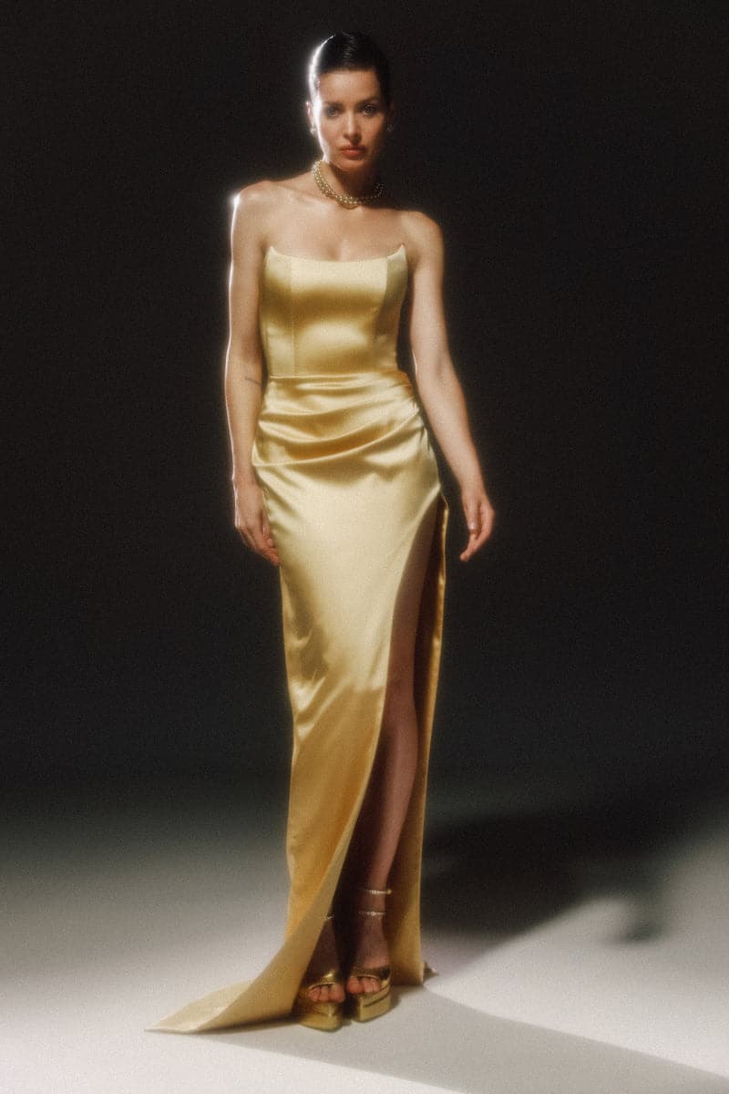 ANASTASIA MAXI GOWN is the perfect gown for your festive look. A classic sheath silhouette is complemented by a semicircle corset top, with a high thigh slit for a contemporary twist.