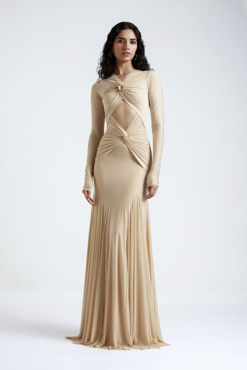 Full-sleeve gown featuring a twisted knot design at both the bust and waist.