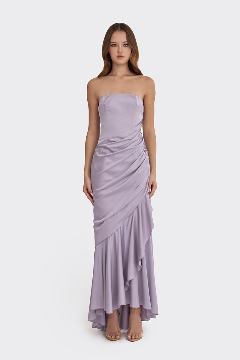 - Strapless dress with delicate ruching and gathering details.