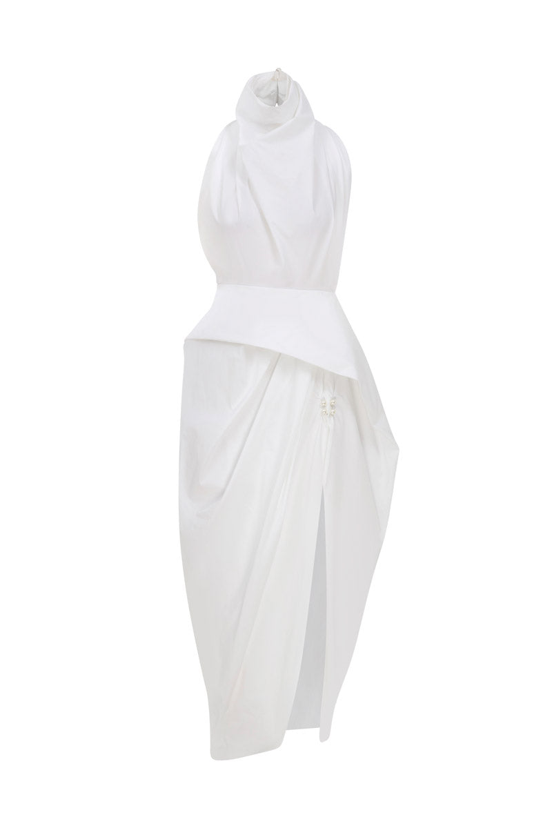 his chic white dress features a high neck and elegant asymmetrical draping, offering a sophisticated silhouette. Ideal for elegant gatherings, complement it with black heels and simple jewelry to highlight its unique design.
