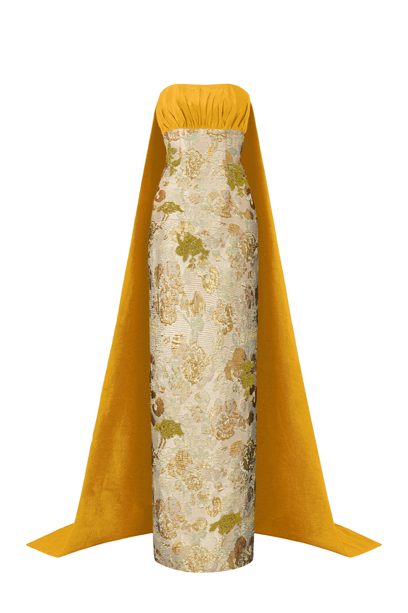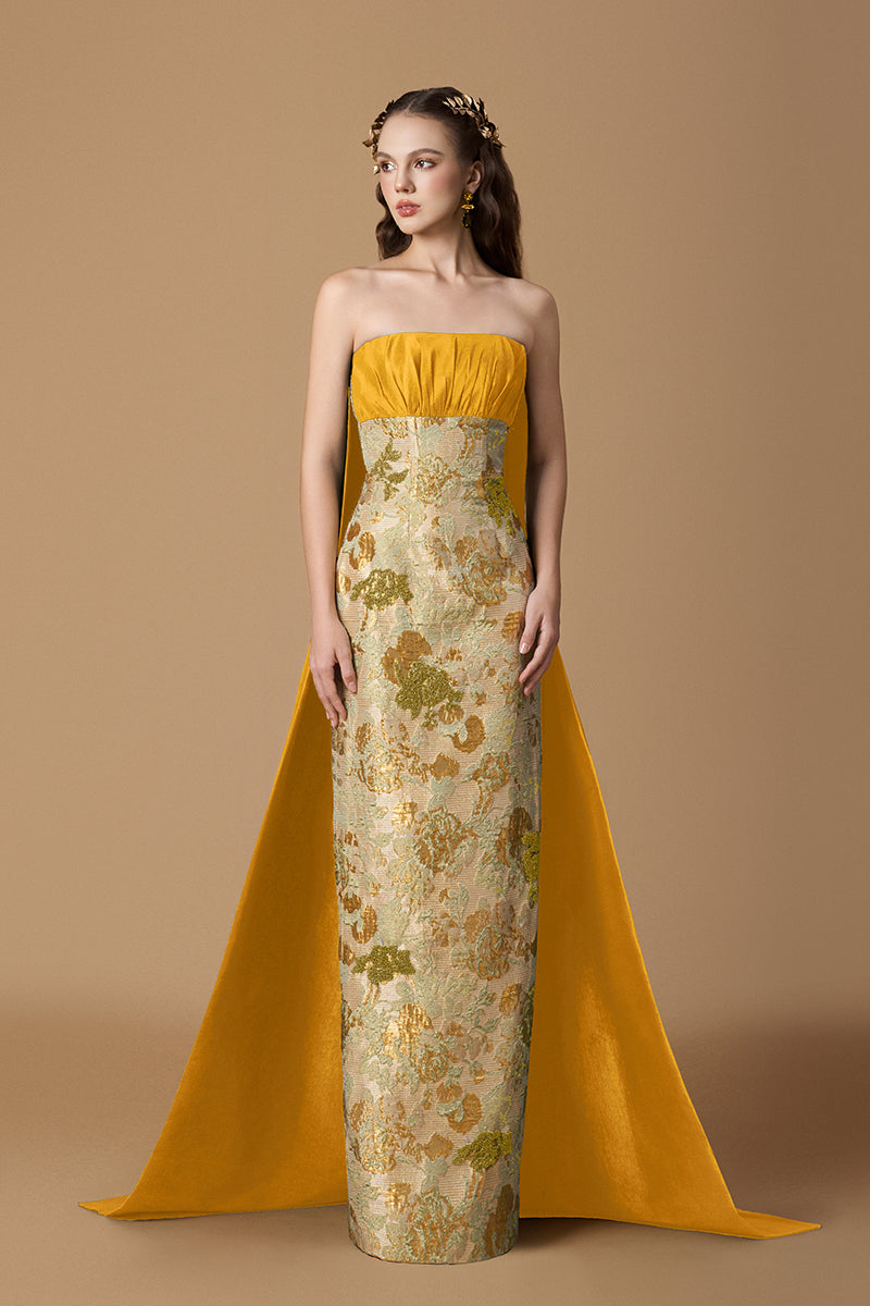 The strapless column gown in green floral metallic jacquard blends regal elegance with refined craftsmanship. The sculpted bodice and elongated back train create a statuesque profile, while embroidered floral patterns adorned with crystals evoke a sense of timeless luxury. Perfectly balanced between boldness and grace, this piece defines evening sophistication.