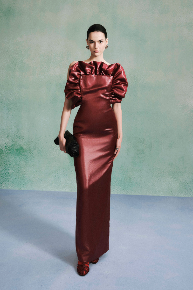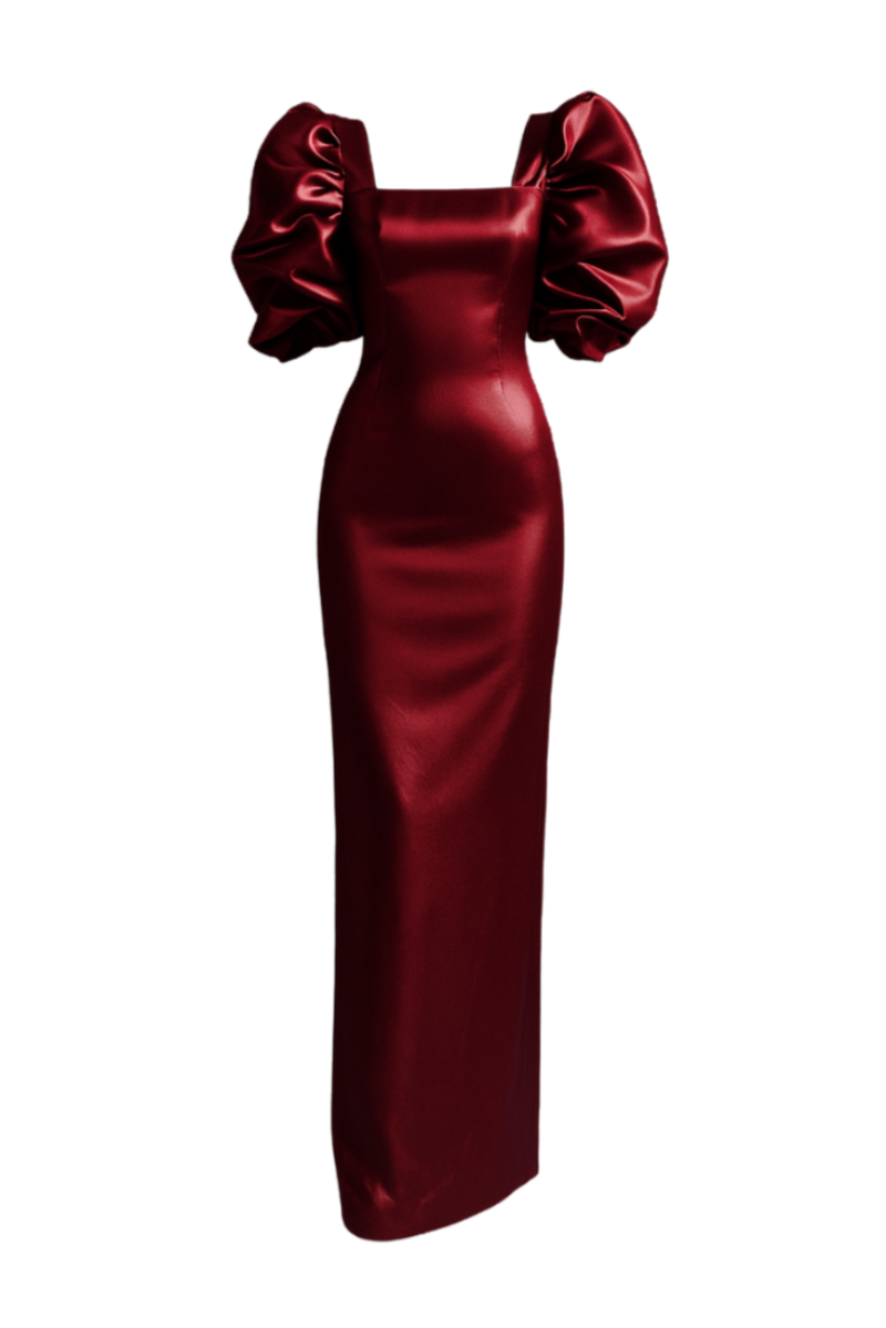 The dress is a striking, floor-length gown crafted from a rich, glossy burgundy fabric that catches the light with a luxurious sheen. It features a dramatic square neckline framed by voluminous puff sleeves that are gathered and sculpted, adding bold architectural interest to the upper body. The bodice is form-fitting and seamlessly transitions into a sleek, column-style skirt that skims the body and falls straight to the floor, emphasizing an elongated silhouette. The overall design exudes modern glamour with a touch of vintage elegance, balancing structured drama with clean, minimal lines.