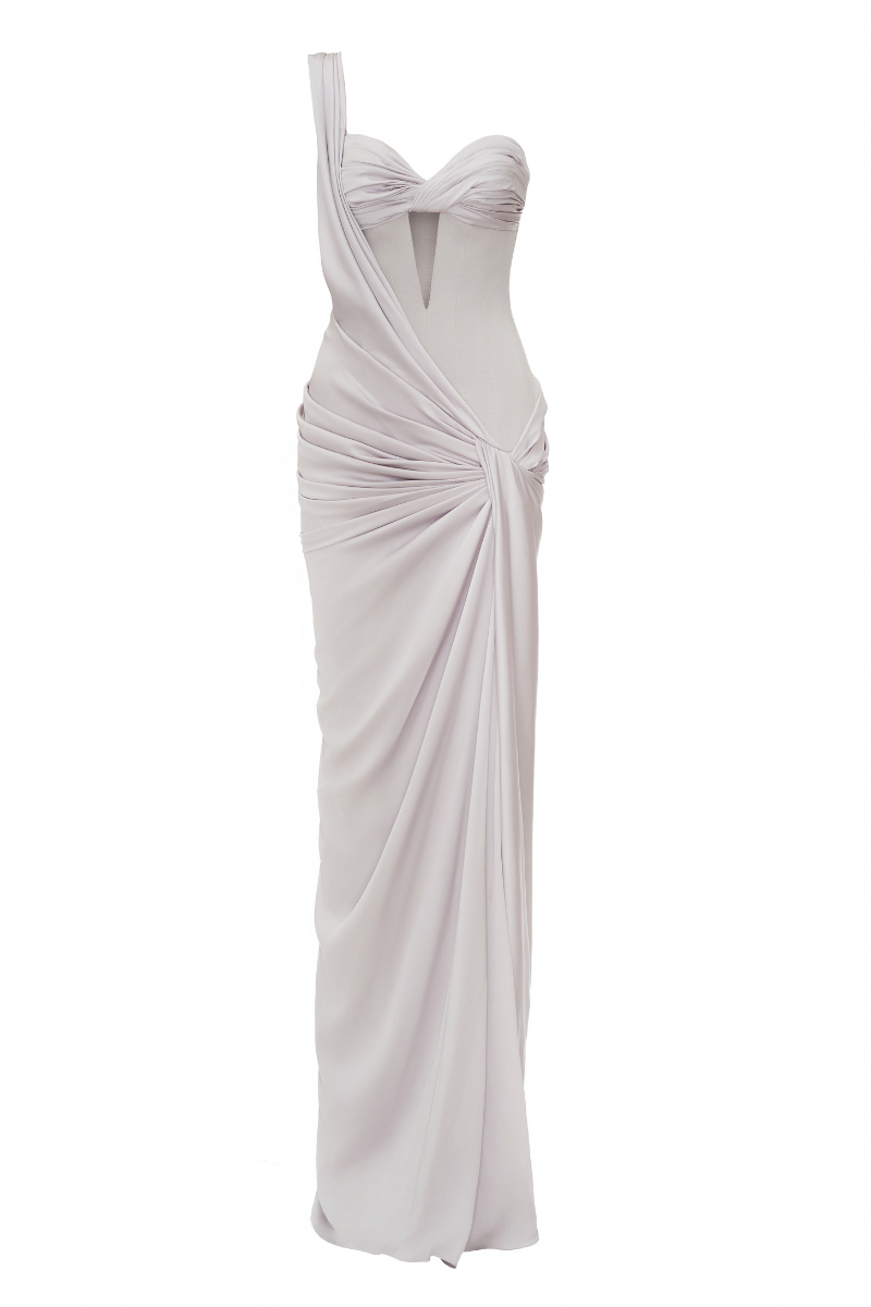 The faux corset boning is used to create a slim waist, accentuated by a silk sash cascading from the shoulder and wrapping around the hips. The bust area is crafted to fit snugly, with delicate and intricate silk pleats.