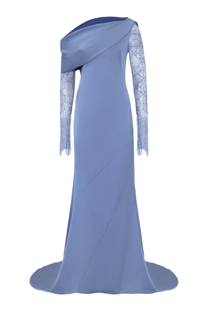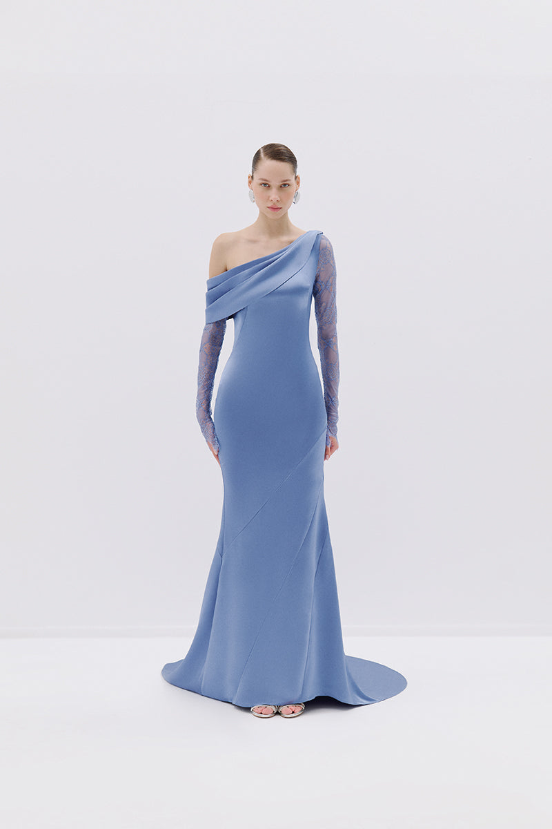 The design includes a draped, asymmetrical neckline and a long, lace sleeve on the one side, adding texture and elegance.