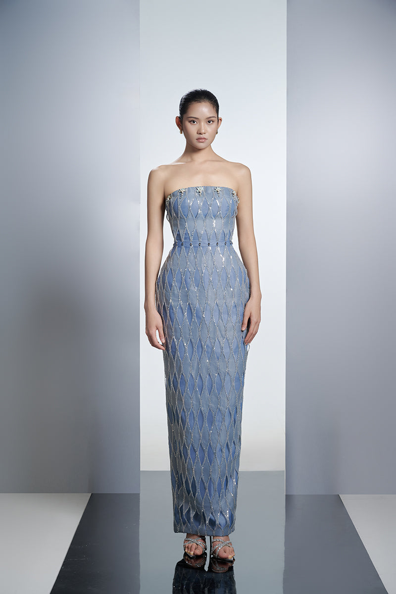strapless column organza maxi dress in blue