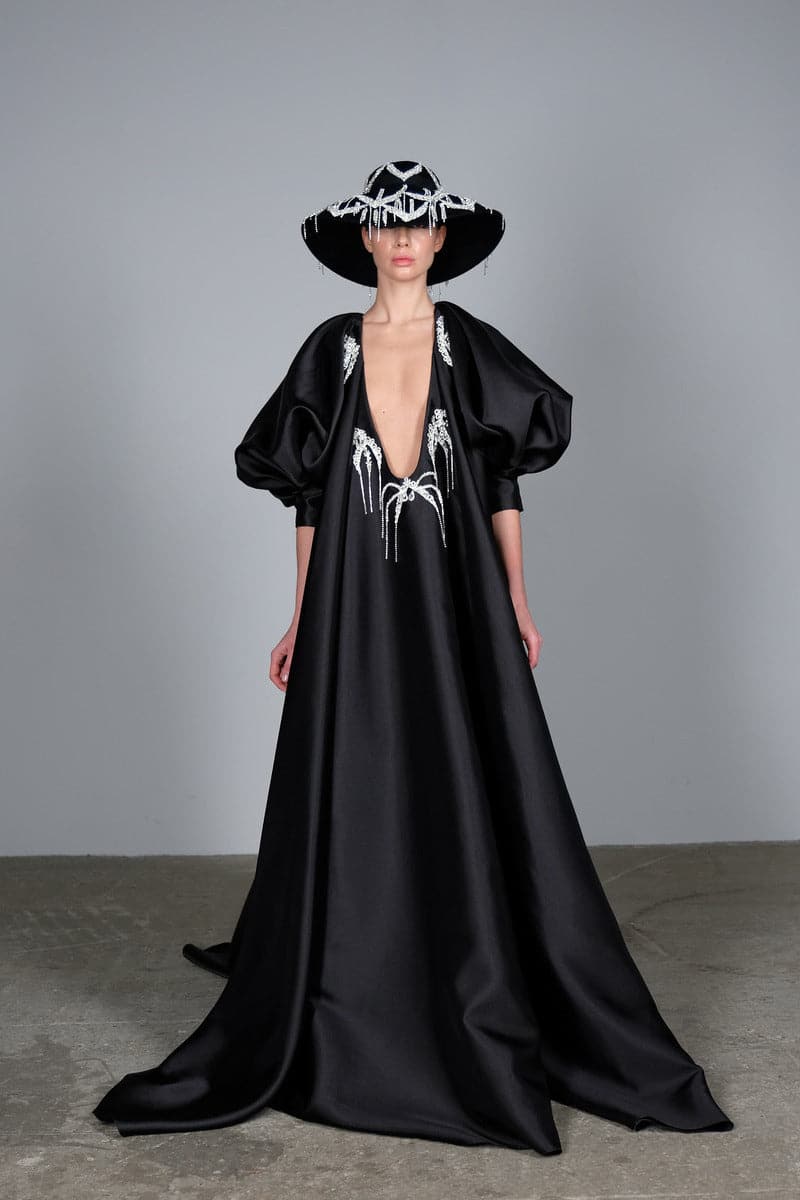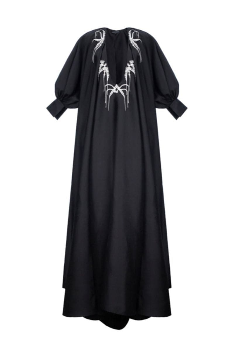 Luxuriate in this opulent taffeta maxi dress from Ukraine. Featuring hand-embroidered crystals and a chest cutout, with voluminous sleeves for added drama.