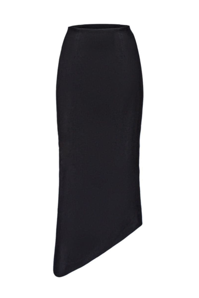black high-rise asymmetric midi skirt
