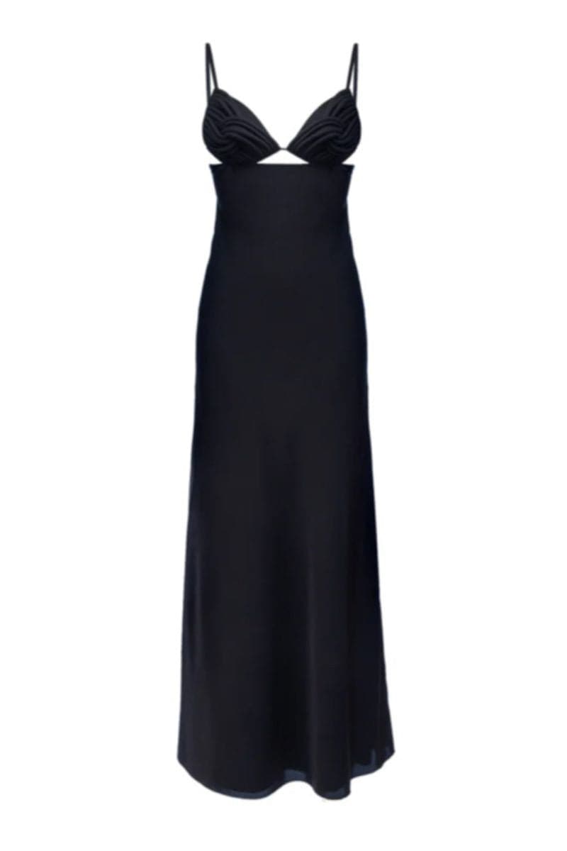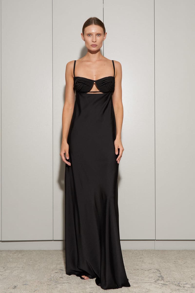 This maxi dress boasts an open neckline and is embellished with textile braids, exuding an air of sophistication and luxury. It features a zipper on the back and is proudly crafted in Ukraine.