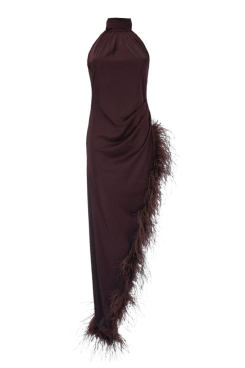 brown midi dress with boa