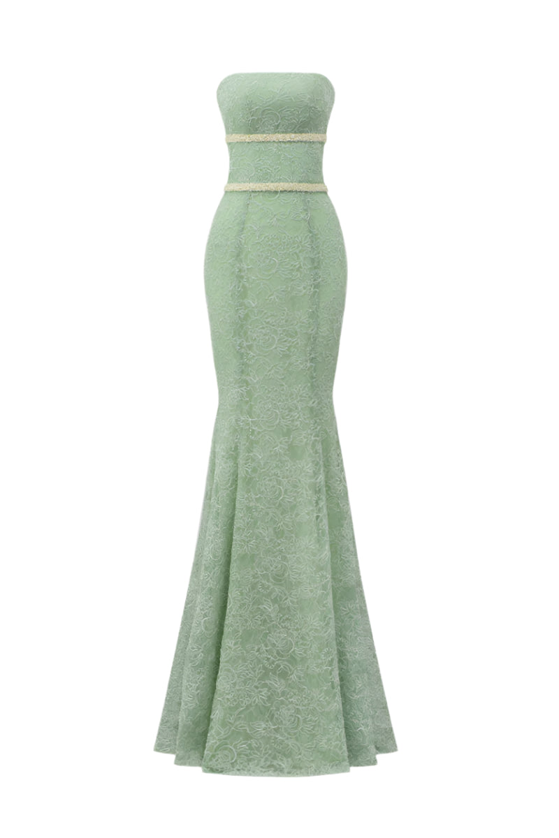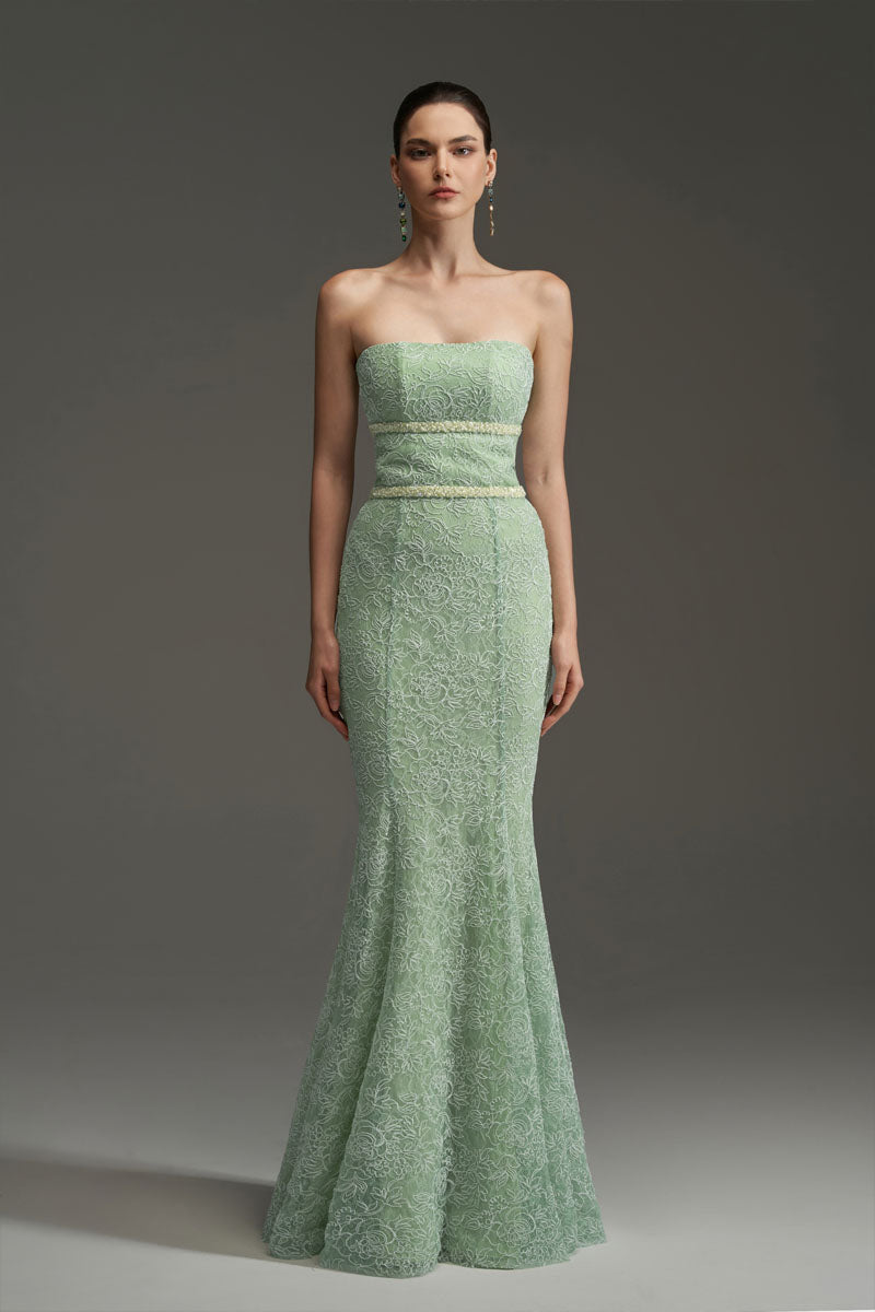 Alluring and sculpted, this mermaid gown brings together femininity and craftsmanship in perfect harmony. The strapless bodice is cut to contour the body, showcasing delicate floral mesh lace over a mint green base. Pearl and crystal embellishments define the bust and waistline, adding soft shimmer and structure, while the flared hemline and flowing silk panels evoke fluid movement with every step.