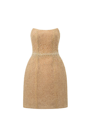 This beige mini dress features a corset bodice and bell-shaped silhouette that flatters the form with subtle volume. Crafted from floral mesh lace and lined in chiffon, the design is elevated by an embellished crystal waistline, where hand-applied ivory stones radiate outward in a soft sparkle.