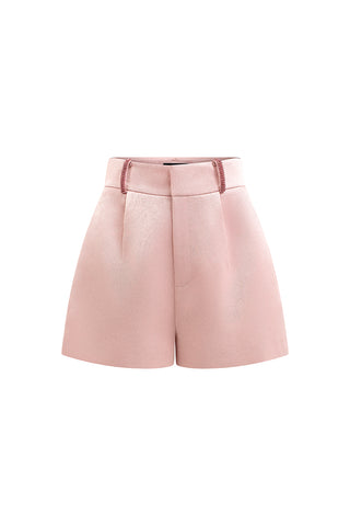High-waisted pink taffeta shorts featuring a clean, tailored finish. Designed with a minimalist aesthetic, these shorts pair perfectly with the matching blazer for a chic and modern set, offering a sharp yet feminine silhouette.