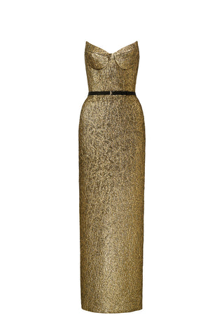 This midi column dress features luminous metallic-lacquer jacquard, woven with depth and texture reminiscent of liquid metal. The clean bustier neckline offers sleek balance, while the lotus-petal accents introduce a sculpted, couture-inspired element at the hem. A blend of structure, glow, and florally inspired craftsmanship, the design brings bold sophistication to any occasion.