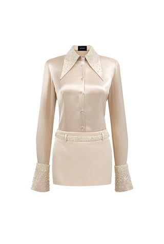 This elegant ensemble exudes modern sophistication with its sleek satin shirt, tailored to perfection with a structured collar and crystal-embellished cuffs for a touch of opulence. Paired with a low-rise mini skirt adorned with delicate crystal accents on the waistband, the look strikes a balance between classic refinement and contemporary allure. The luxurious sheen of the fabric enhances its timeless appeal, making it a chic choice for any high-fashion occasion.