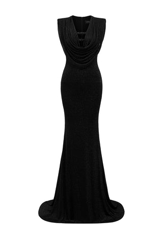 Floor-length jersey gown featuring a draped cowl-neckline, adding depth and elegance to the sleek silhouette. The soft jersey fabric skims the body, while delicate embellishments across the bust hidden behind the neckline provide a touch of sparkle. Perfect for evening wear, this dress combines modern sophistication with timeless glamour.