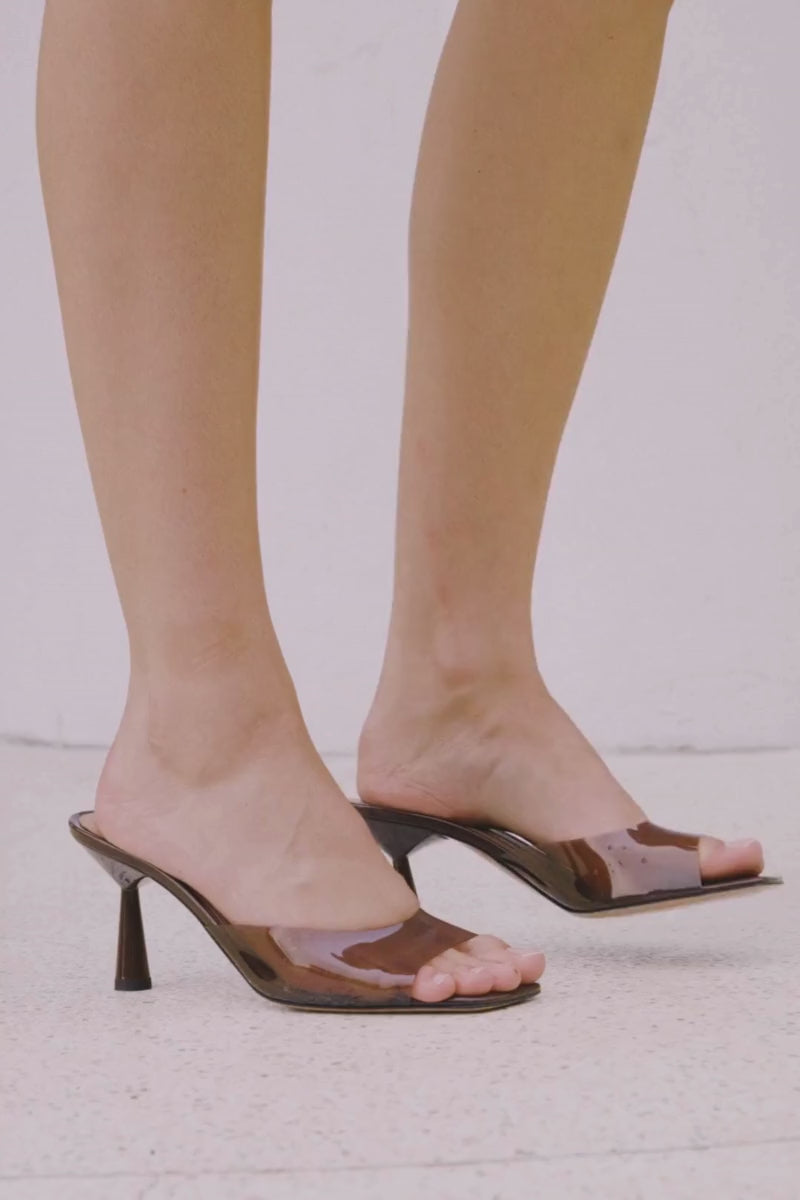 The Greta mule blends classic elegance with a modern sculptural heel. It features a low-cut PVC upper set on a comfortable 70mm square-toe heel in rich chocolate brown, creating a 'barely-there' silhouette that complements any look.