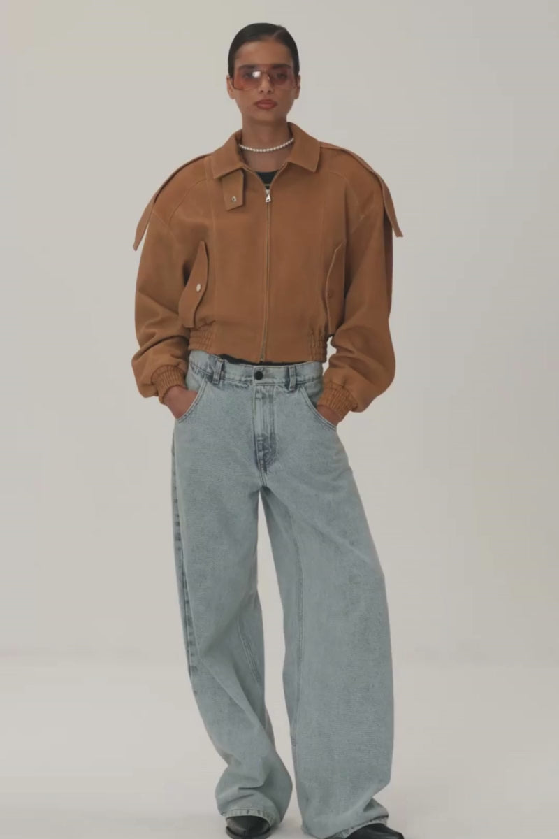Leather bomber jacket made from textured snake-effect crock leather. Features strongly defined shoulders with extended tabs and distinctive snap-fastened pockets on the front. The waist has a ribbed hem with snap-tab details. The stand-up collar fastens with a nickel snap and folds down into a stylish collar. The Giacche di Pelle line is crafted from high-quality Italian leathers in an artisanal leather workshop with long-standing traditions.