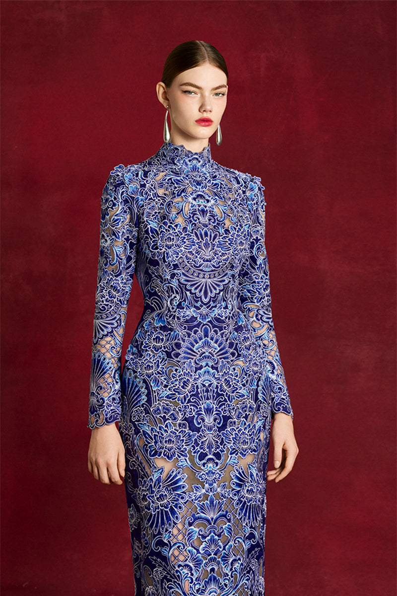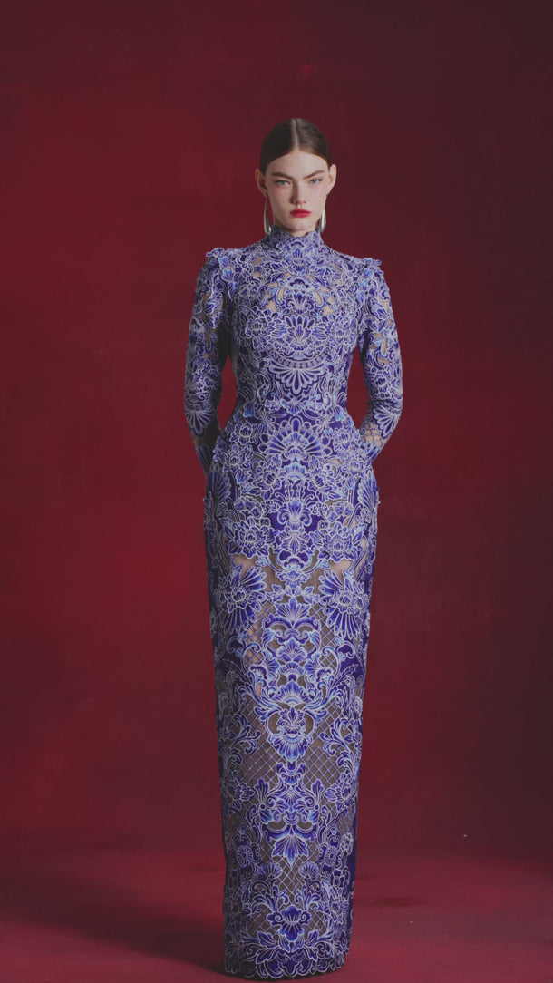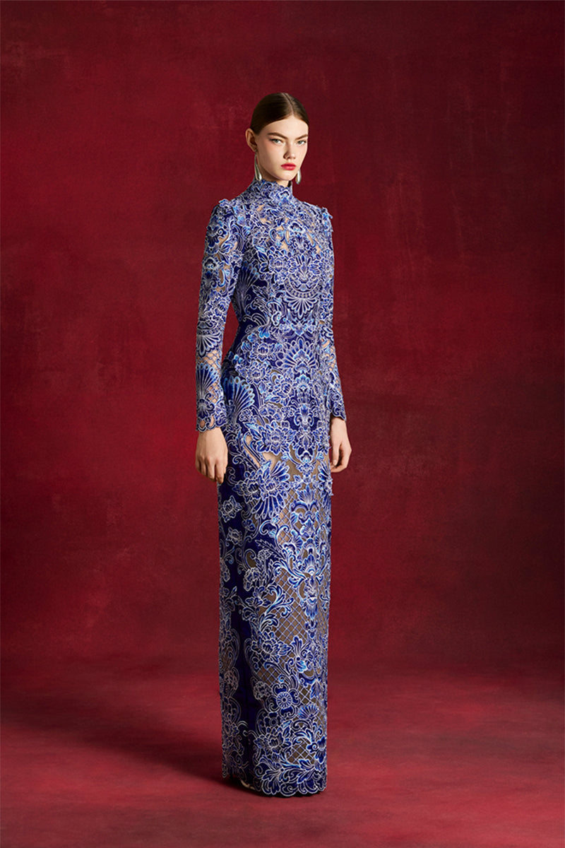 - High-neck, long-sleeved column gown
