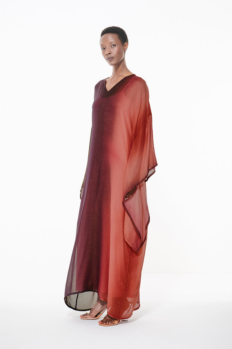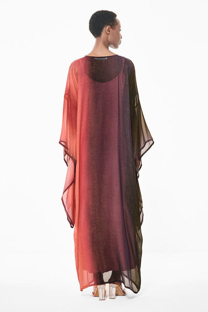 The Gradient Print Kimono Kaftan brings together fluid form and a touch of shine. Crafted in lightweight lurex fabric with a subtle metallic sheen, it catches the light beautifully with every move. A relaxed silhouette designed for effortless winter sophistication.