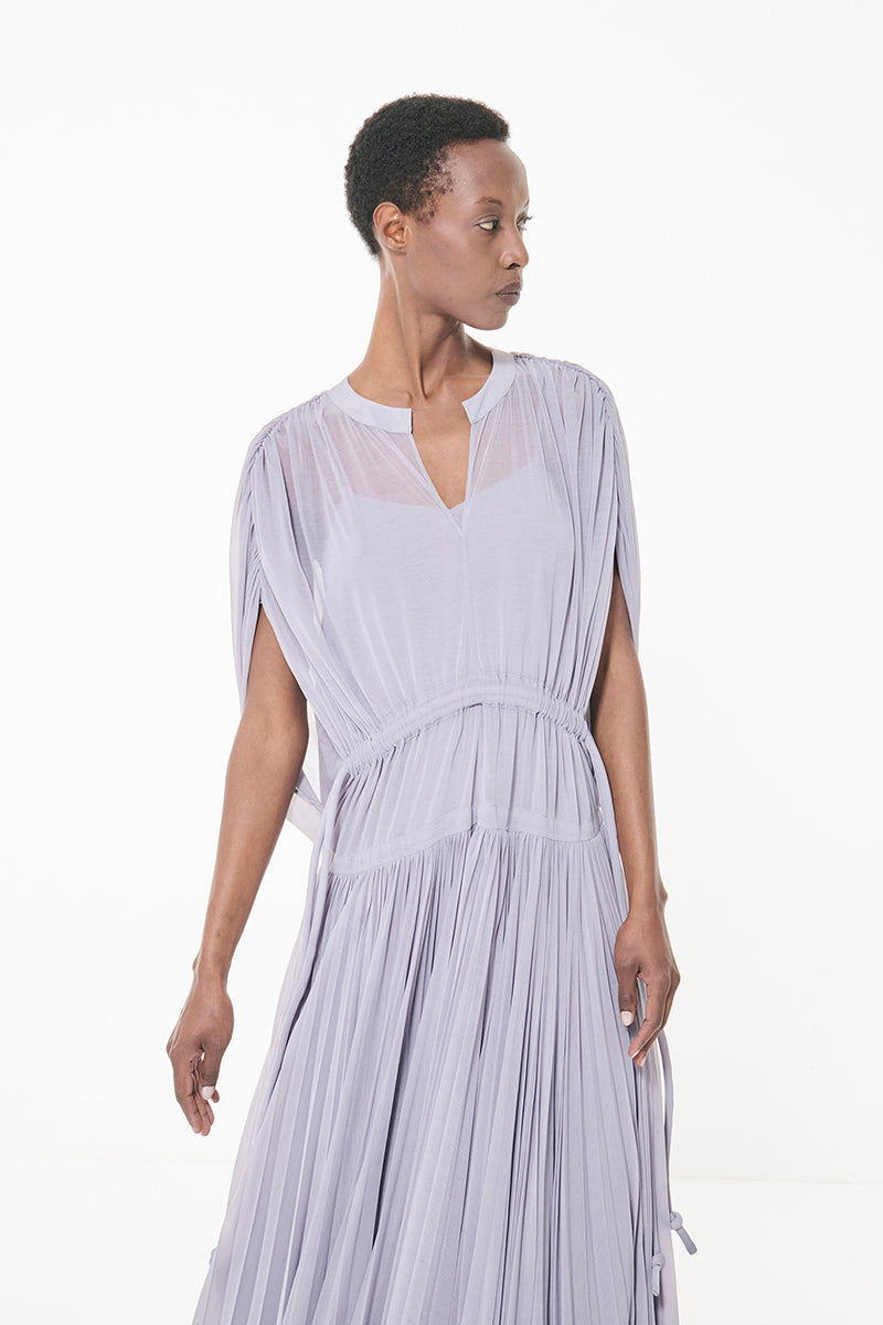 pleated marked waist dress in dust lavender