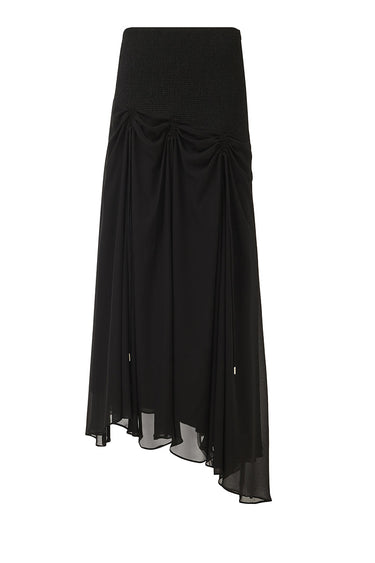 The Smocked Waist Skirt defines fluid shape with its asymmetric hem and soft layered design. Ties at the front and back add subtle texture, finished with metallic bead details for a refined edge. Lightweight and versatile, it pairs beautifully with simple tops for effortless styling.